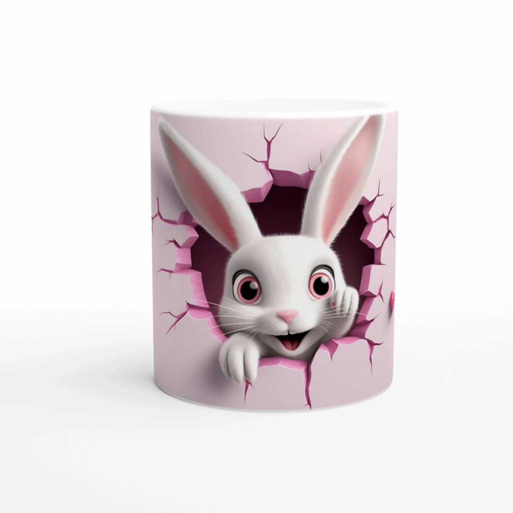 Çatlaktan Bakan Neşeli Tavşan Temalı Baskılı Kupa Bardak, çatlak duvar efekti, pembe kalp dokunuşları ve sade arka planıyla hem minimal hem de sevimli bir görünüm sunuyor. Çocuklara özel ya da eğlenceli bir hediye seçeneği arayanlar için mükemmel.
