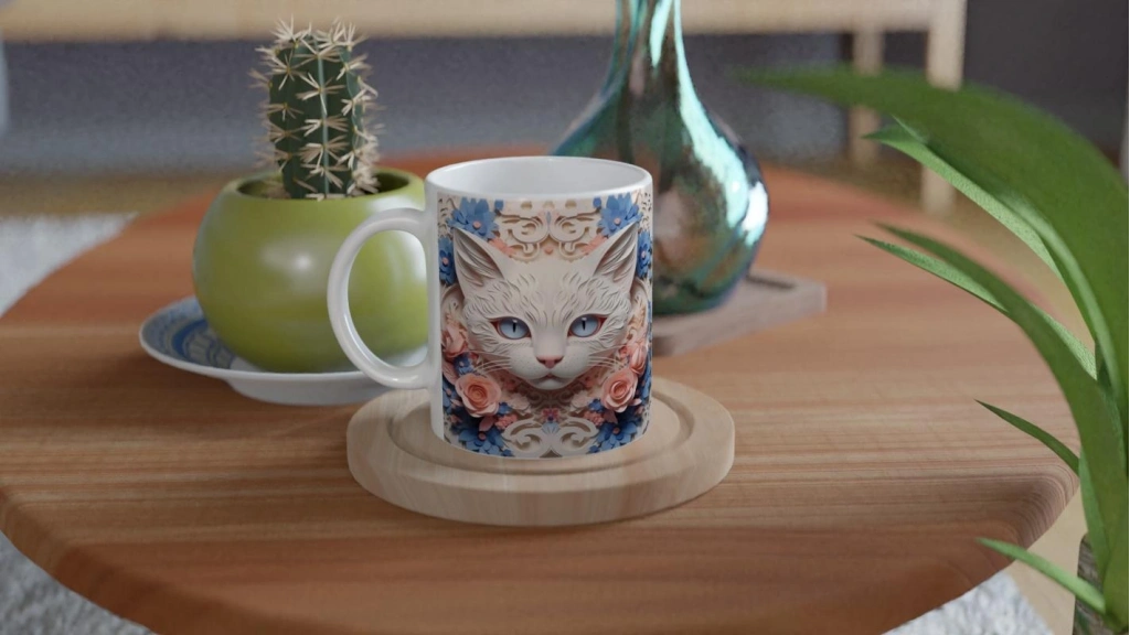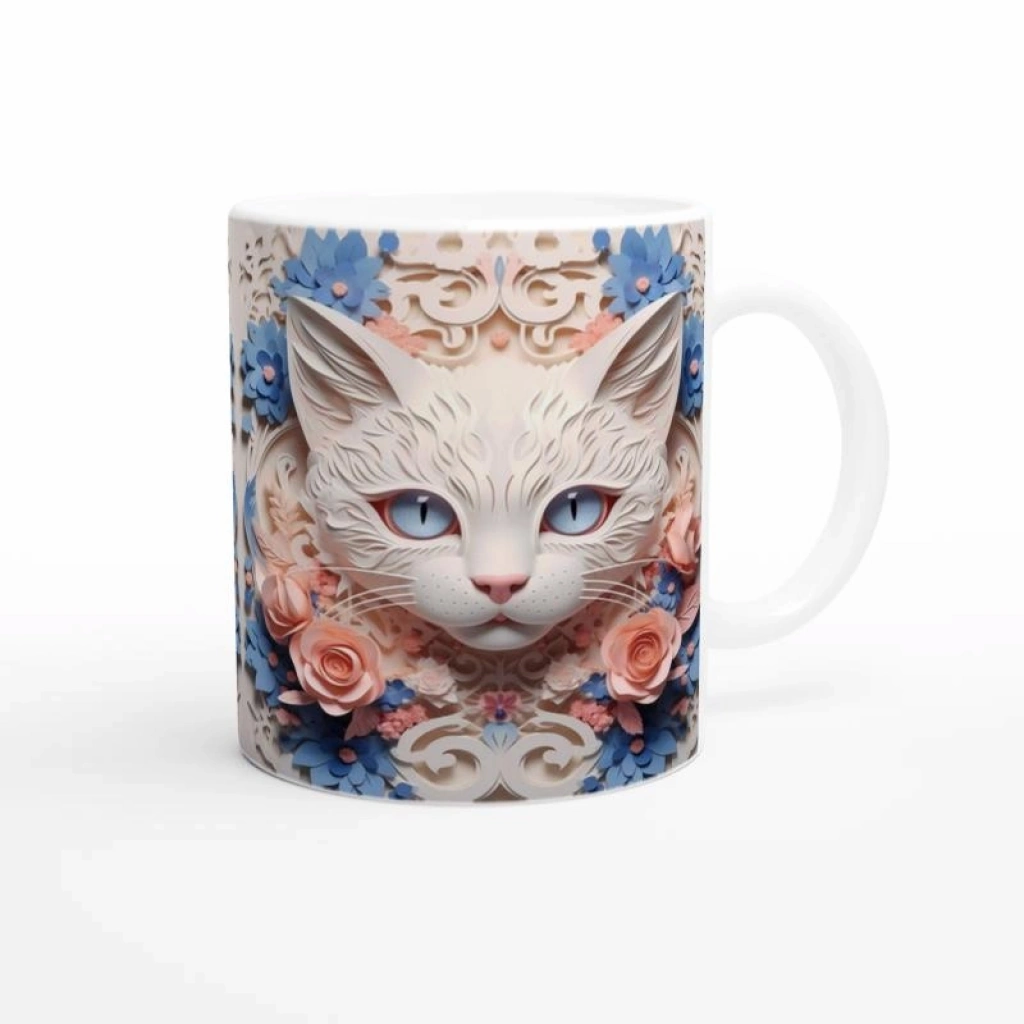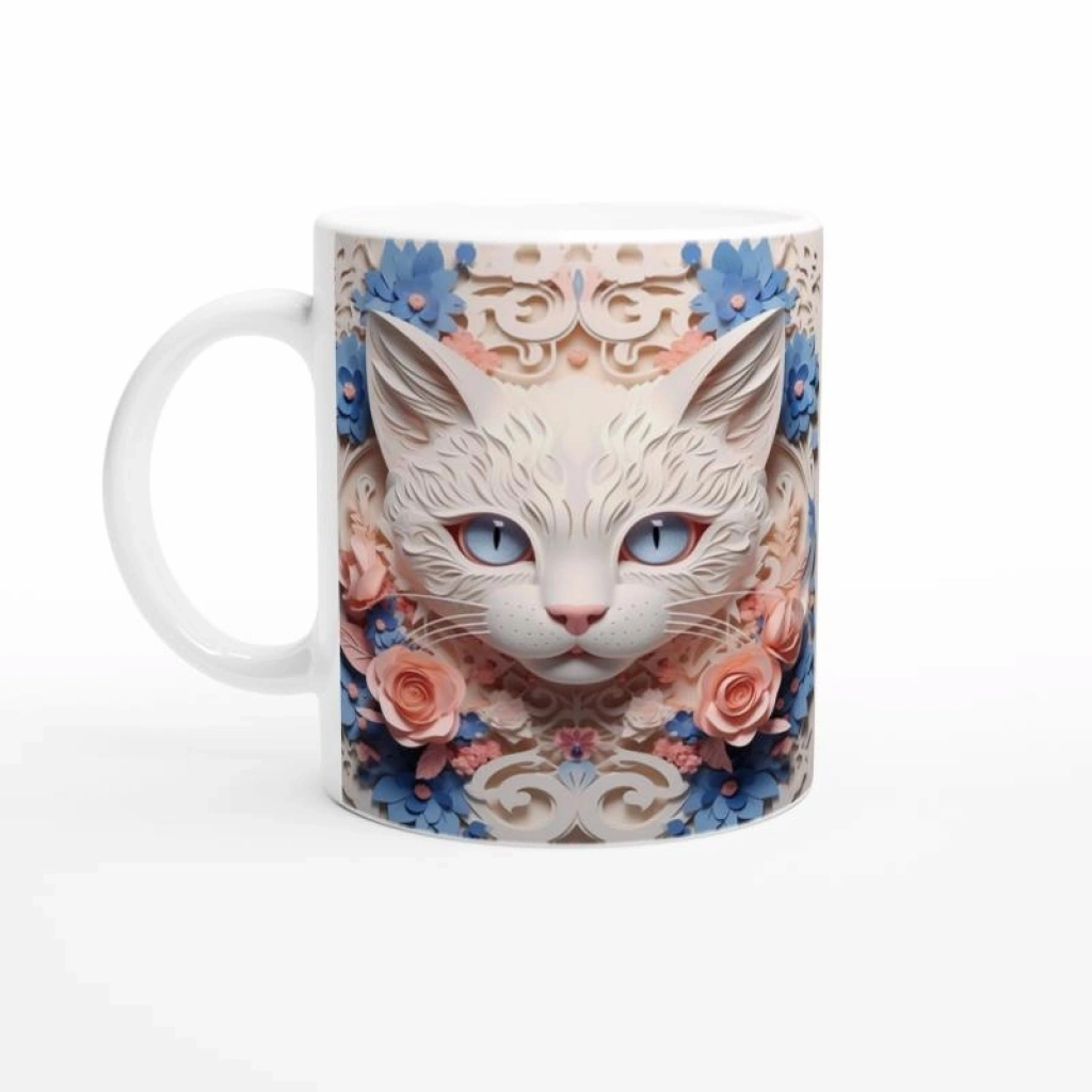Çiçek Çerçeveli Zarif Kedi Temalı Baskılı Kupa Bardak, detaylı çizimleriyle dikkat çeken beyaz bir kedinin etrafında pembe güller ve mavi çiçeklerle bezeli romantik bir kompozisyon sunar. Hem kedi severler hem de şık tasarım arayanlar için benzersiz bir hediye alternatifidir.