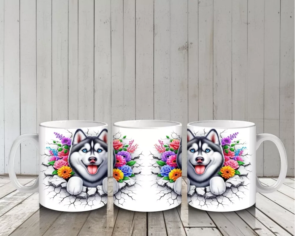 Çiçek tacıyla süslenmiş bu gülümseyen Husky, zarif ve enerjik görünümüyle dikkat çekiyor. Hem sevimli hem asil bir duruşa sahip bu tasarım, köpek severler için harika bir tercih.