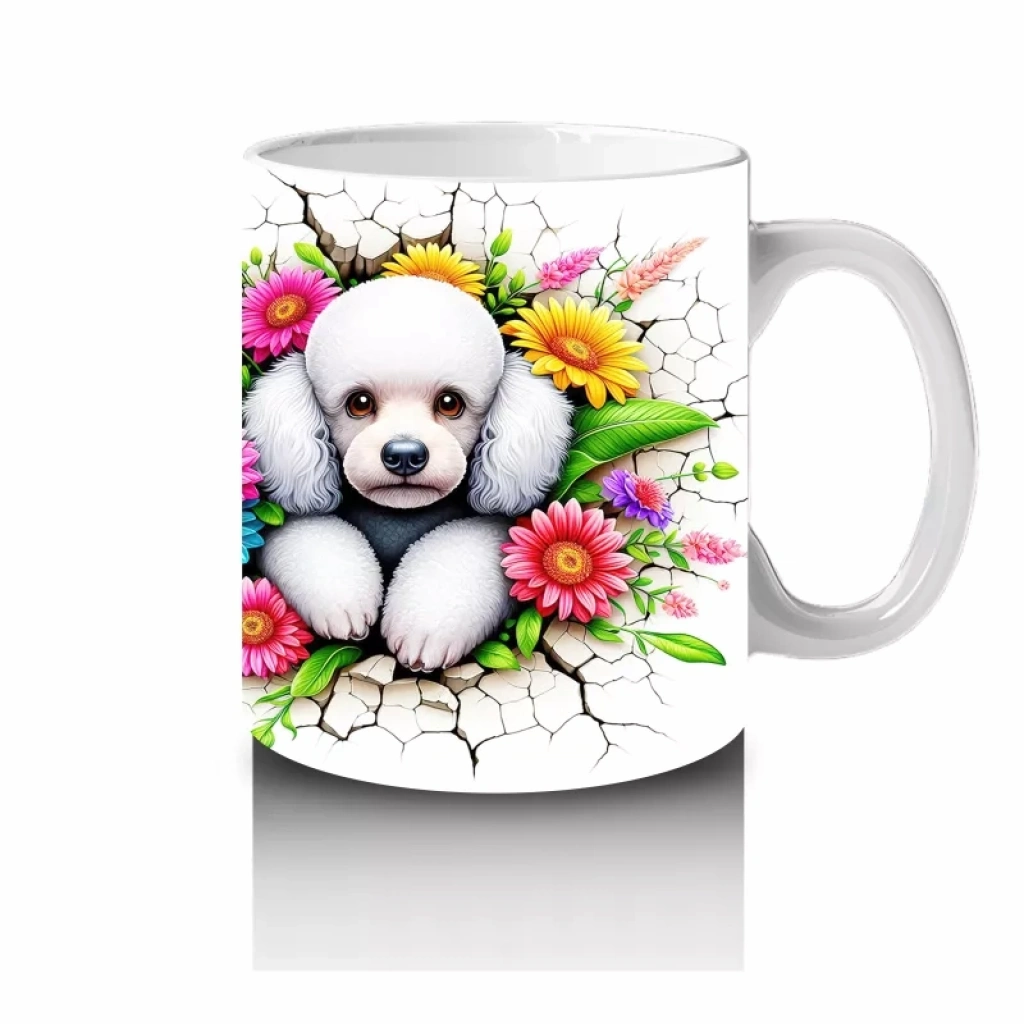 Renkli çiçekler arasında yan yana duran ikiz beyaz yavru köpekler, sevgi ve dostluğun simgesi olarak dikkat çekiyor. Sevimli ve samimi bir atmosfer yaratan şirin bir tasarım.