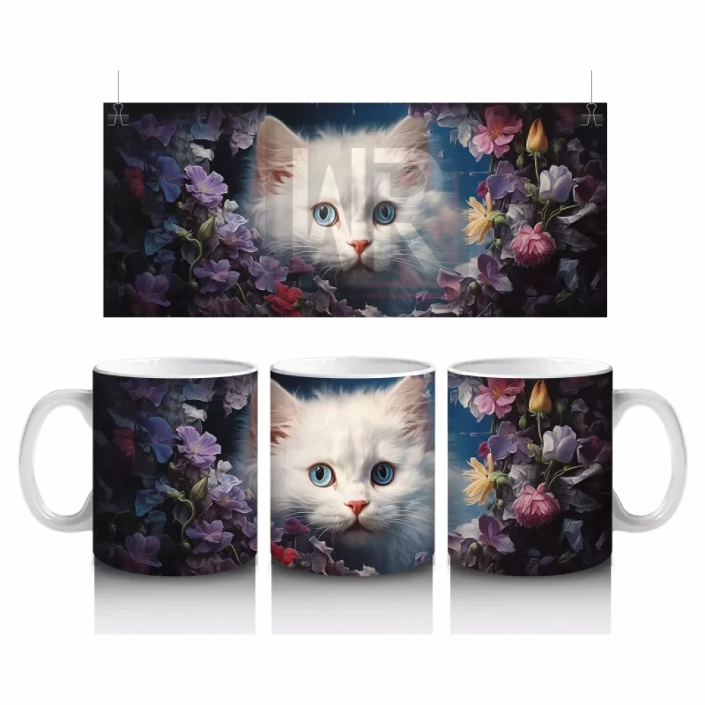 Rengârenk çiçekler arasında huzurla oturan beyaz yavru kedi, masumiyeti ve şirinliği bir arada sunuyor. Kedi severler için doğayla iç içe, içten bir kupa tasarımı.