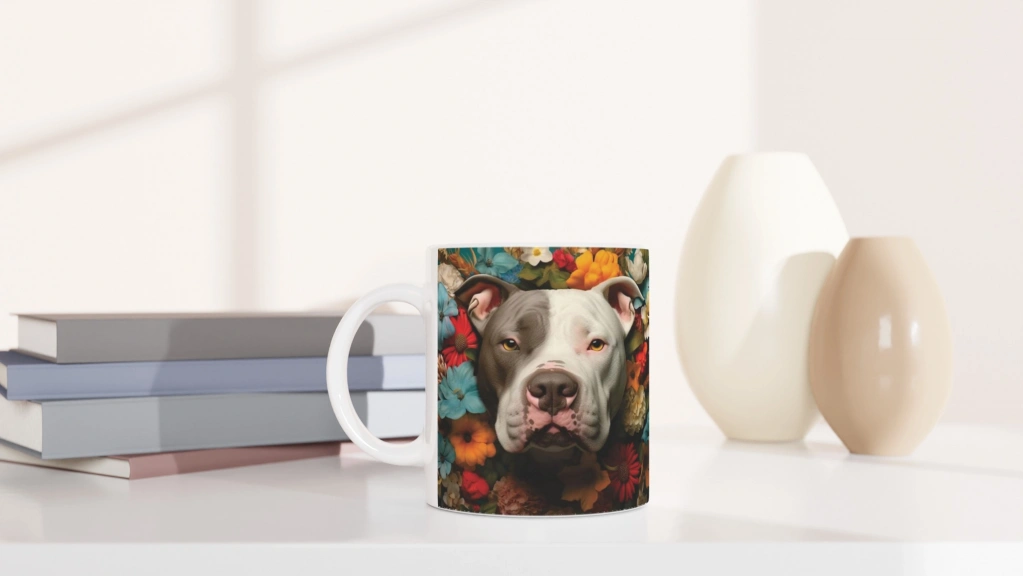 Sadakatin ve gücün zarafetle buluştuğu bir tasarım: çiçeklerle çevrili pitbull baskılı kupa bardak!
