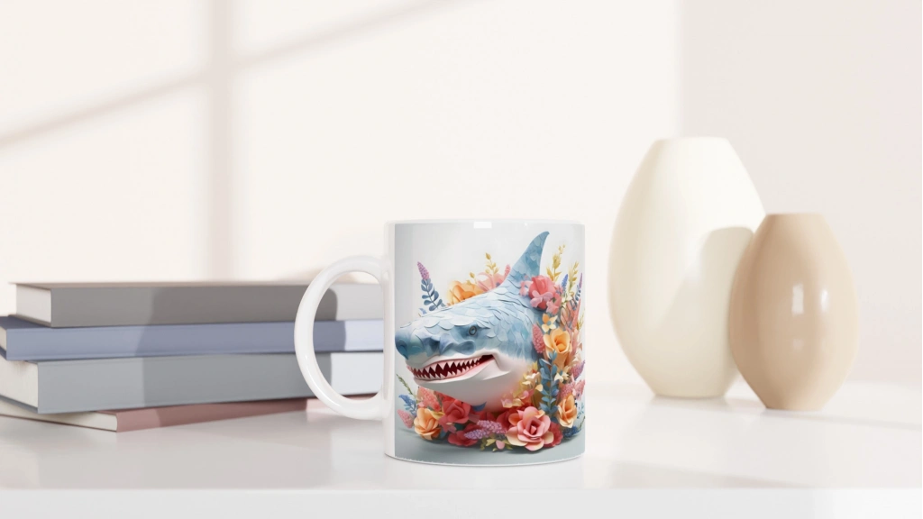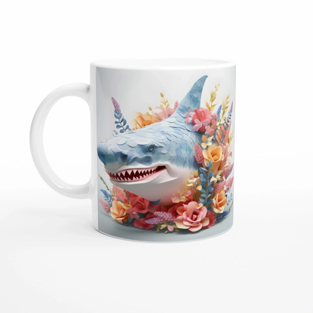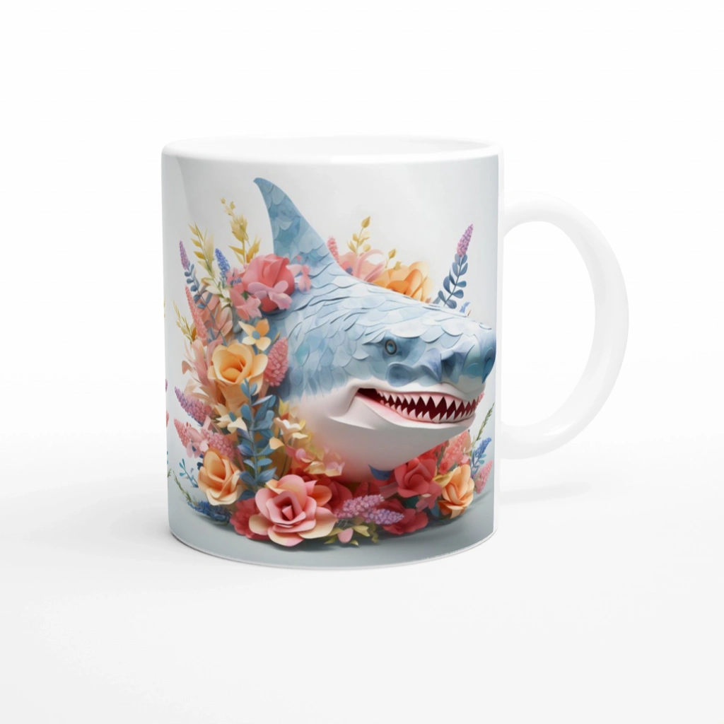 Çiçeklerle Süslenmiş Komik Köpek Balığı Temalı Renkli Kupa Bardak