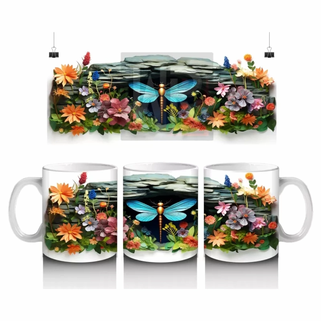 Çiçekli bir bahçede özgürce süzülen mavi kelebek, canlı renkleriyle pozitif bir atmosfer sunuyor. Bahar esintisi ve neşe arayanlara hitap eden ferah bir kupa tasarımı.