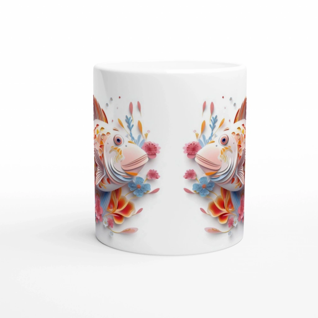 Denizin huzurunu masanıza taşıyan bu çiçekli balık desenli kupa bardak,