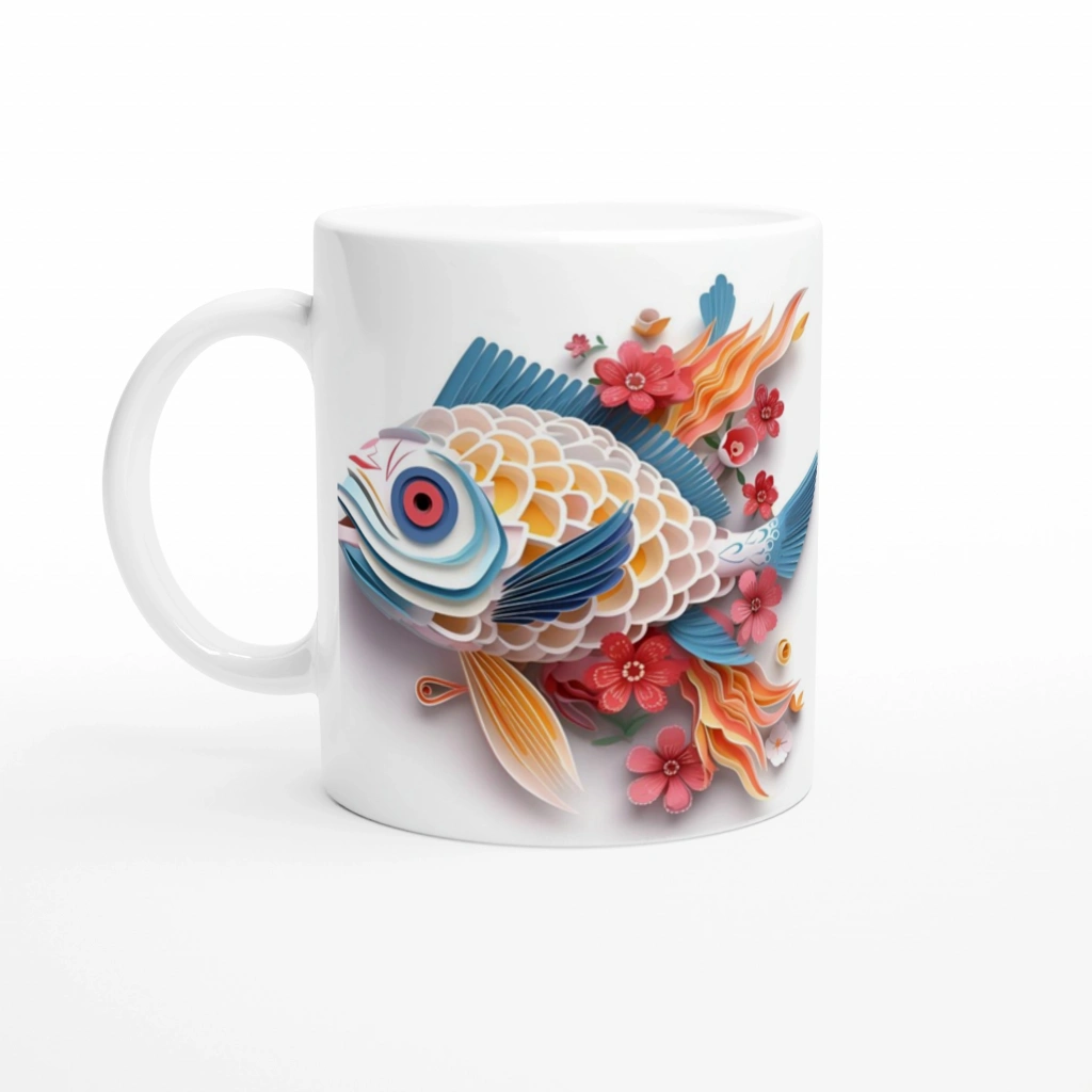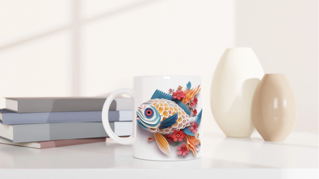Japon balığı baskılı kupa bardak, sadelik ve sanatsal dokuyu bir arada sunuyor.