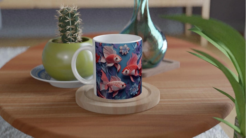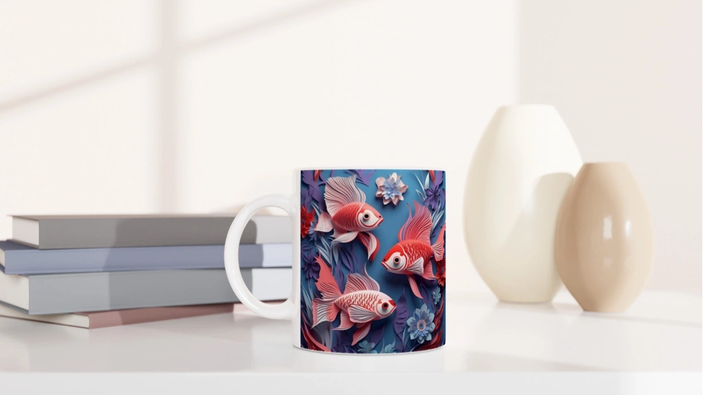 Bu göz alıcı kupa bardak, narin çiçeklerin arasında yüzen Japon balıklarıyla tasarlandı.