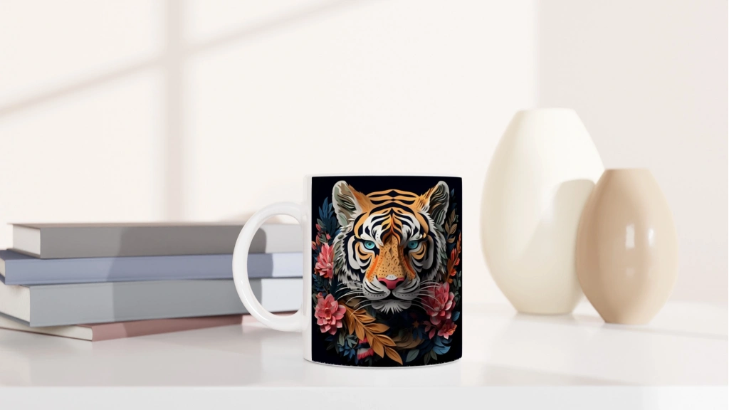 Çiçeklerle çevrelenmiş etkileyici bir kaplan figürüyle tasarlanan bu kupa bardak,