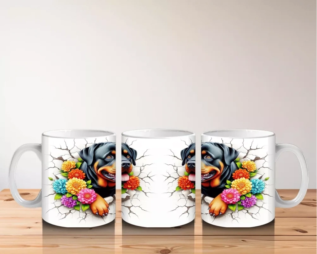Çiçekli tacıyla neşesini yansıtan bu Rottweiler illüstrasyonu, güçlü duruşun sevimli haliyle buluştuğu enerjik bir tasarım sunuyor. Köpek severler için dikkat çekici ve keyifli bir kupa seçeneği.