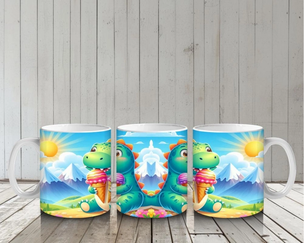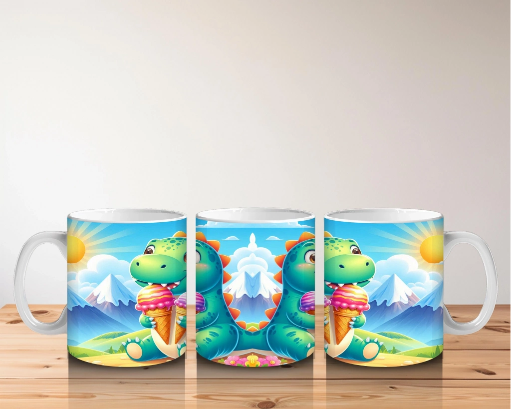 Sıcacık bir günde kocaman bir dondurmayla keyif yapan sevimli dinozor, süt saatini serin ve eğlenceli bir anıya dönüştürüyor.