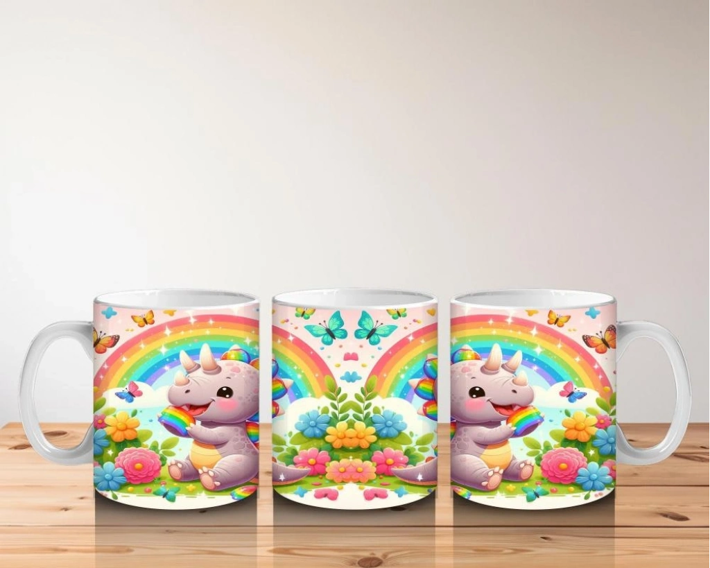 Gökkuşağı şekerleriyle çevrili mutlu bir dinozor… Bu rengârenk tasarım, süt saatini çocuklar için tatlı mı tatlı bir eğlenceye dönüştürüyor.