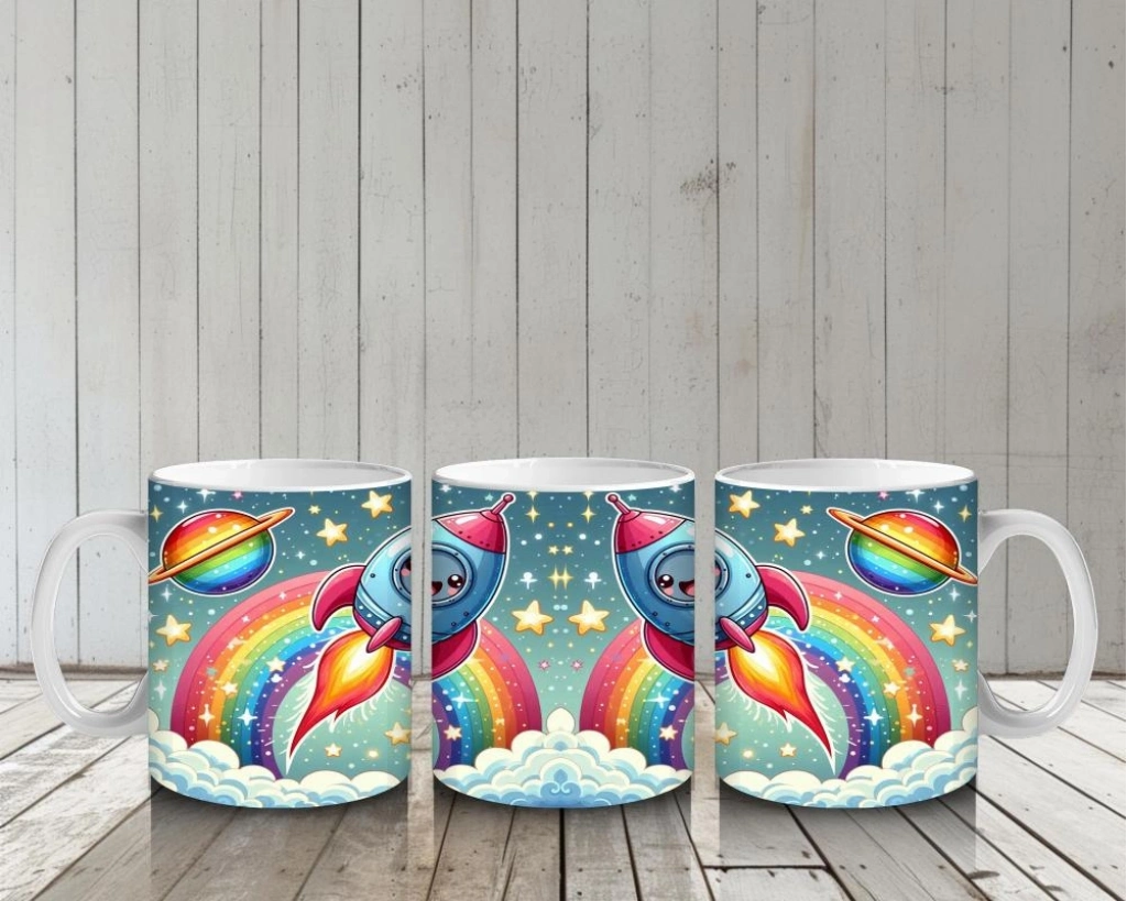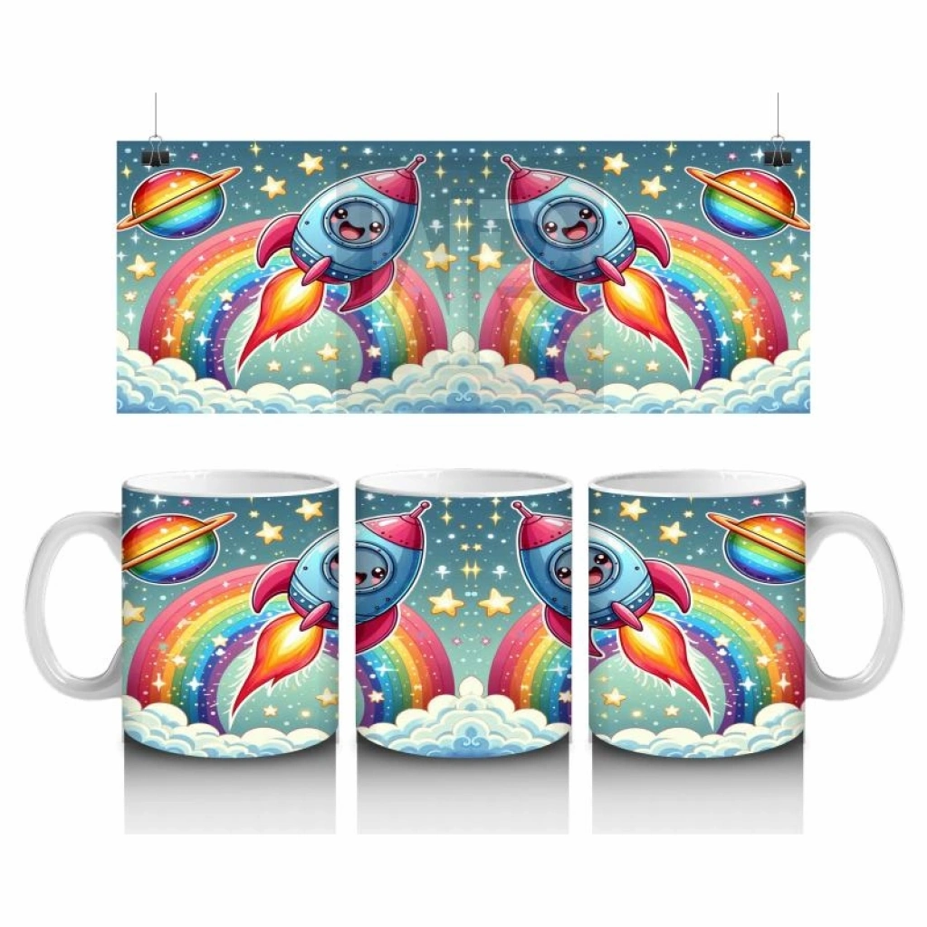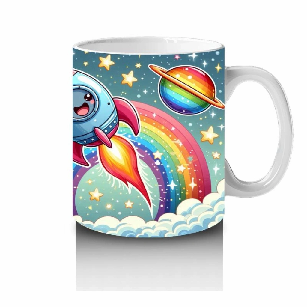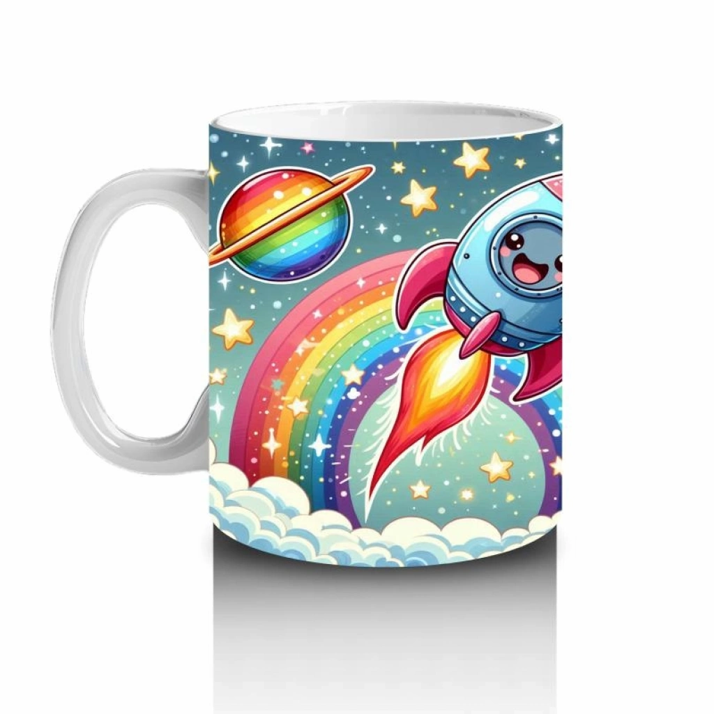 Çocuklara Sütü Sevdiren Gökkuşağı ve Sevimli Roket Yolculuğu Desenli Kupa Bardak