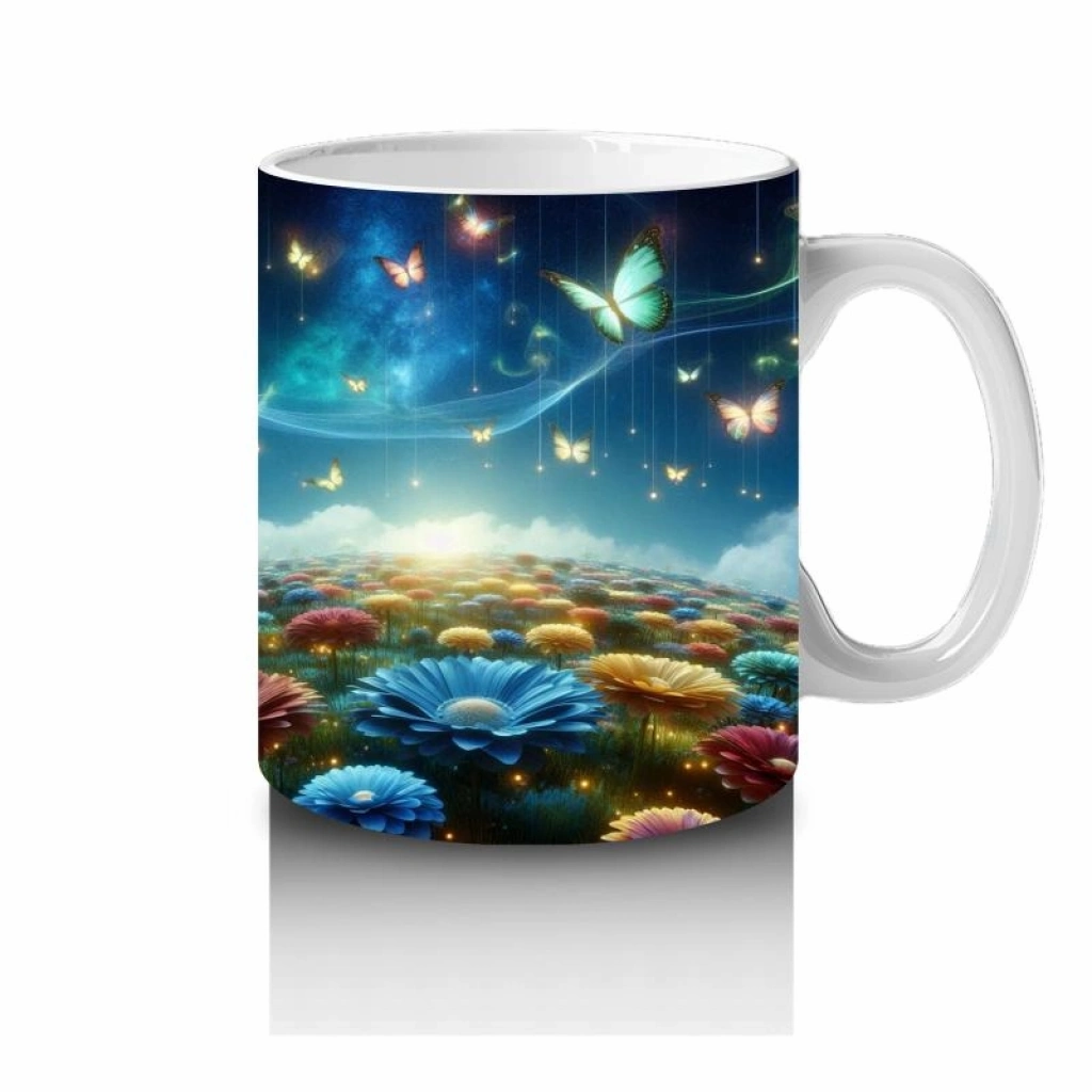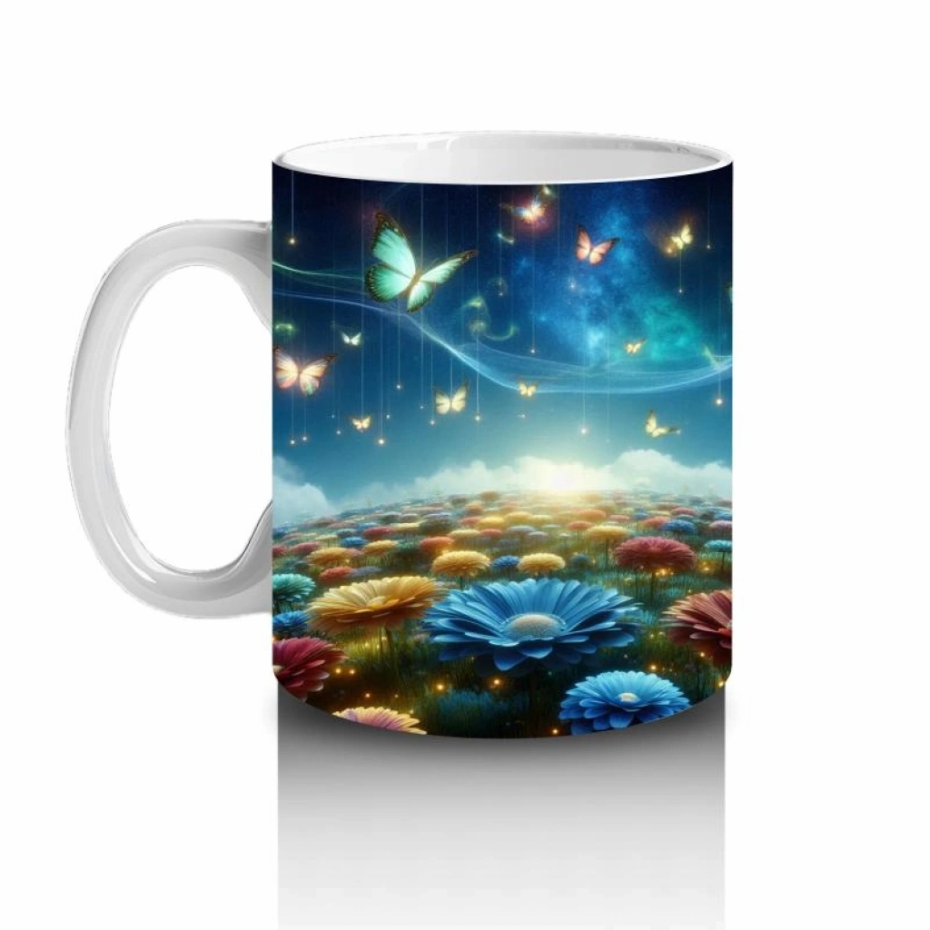 Masal bahçesinde uçuşan ışıltılı kelebeklerle dolu bu büyüleyici tasarım, miniklerin süt saatini huzur ve hayalle dolduruyor.