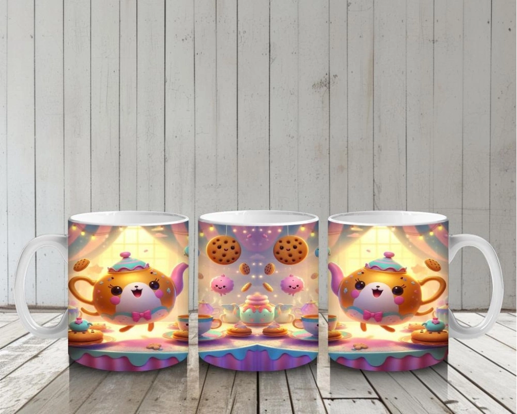 Gülümseyen çay fincanları ve mis gibi kurabiyelerle süslü tatlı bir sofra… Bu eğlenceli kupa, süt molasını miniklere sıcak bir davet gibi sunuyor.