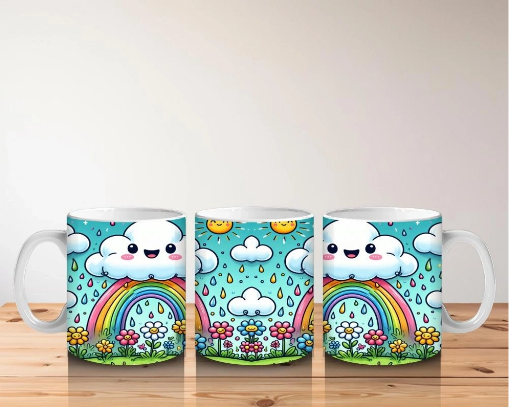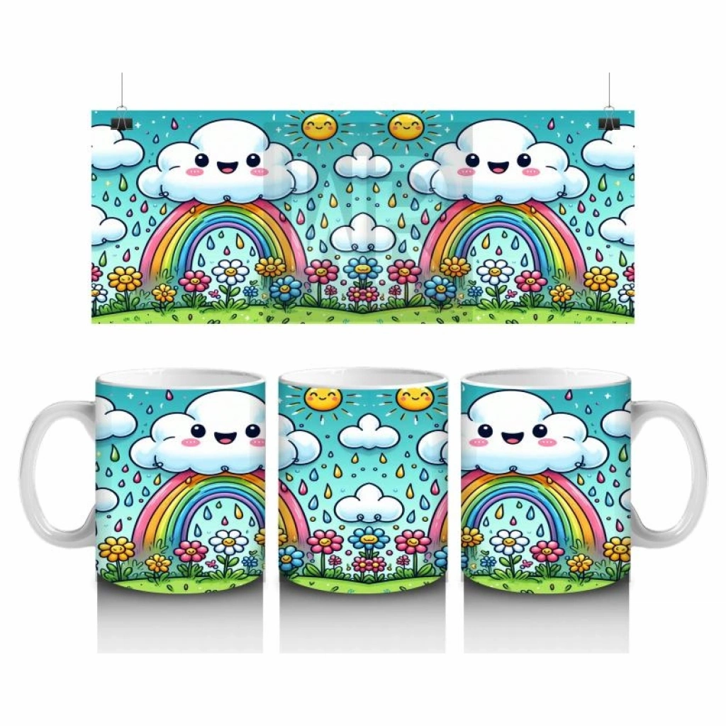 Gökkuşağının etrafında toplanmış neşeli arkadaşlarla dolu bu tasarım, süt içmeyi çocuklar için dostluk ve renklerle süslenmiş bir mutluluğa çeviriyor.