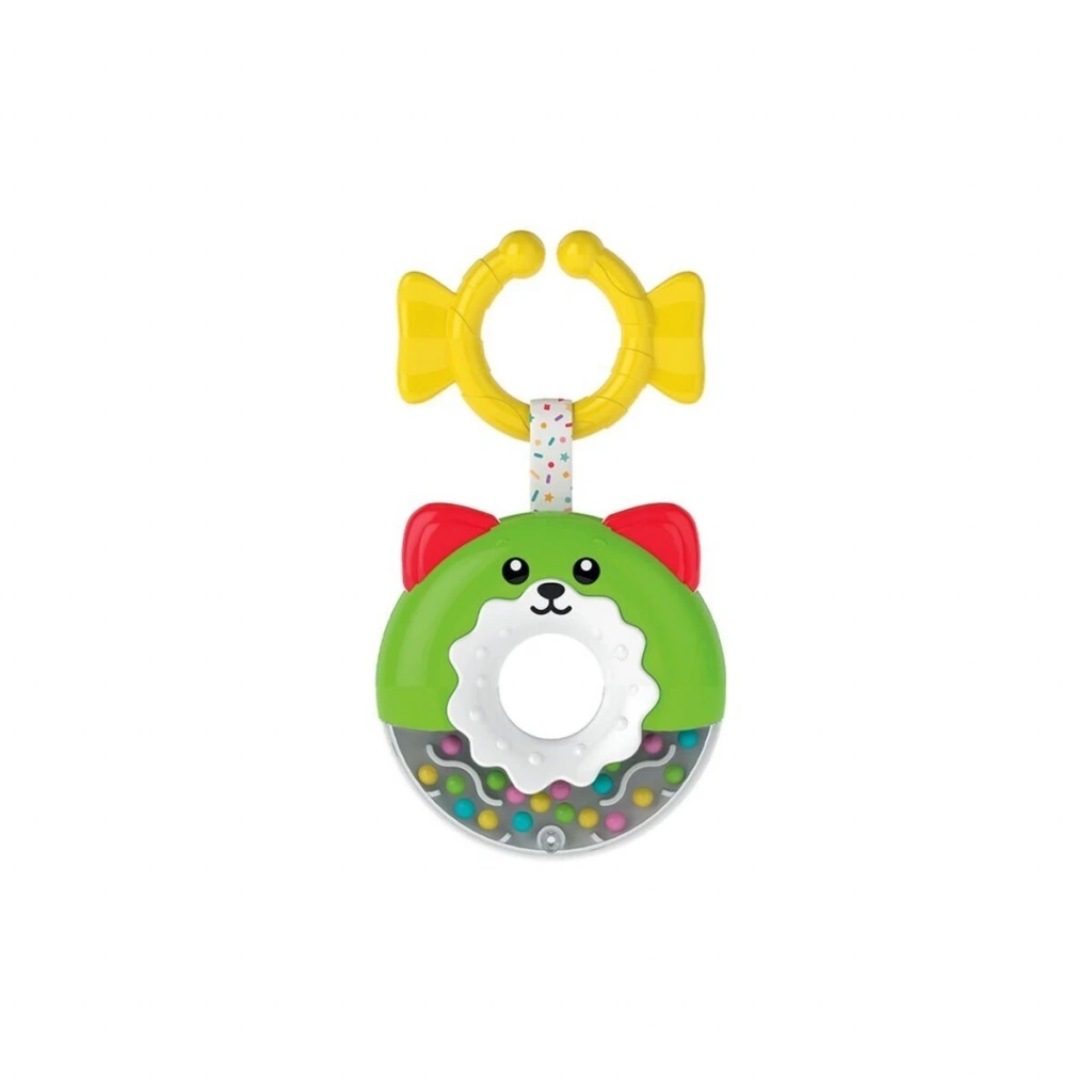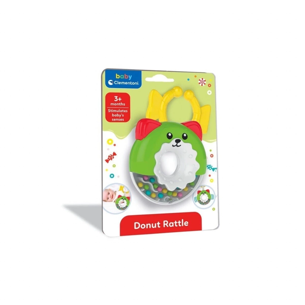 -Çocuğun ısırabileceği dokulara sahip, kaplamalı çörek şeklinde bir çıngırak ve onu karyolaya ya da bebek arabasına asmak için pratik bir halka.