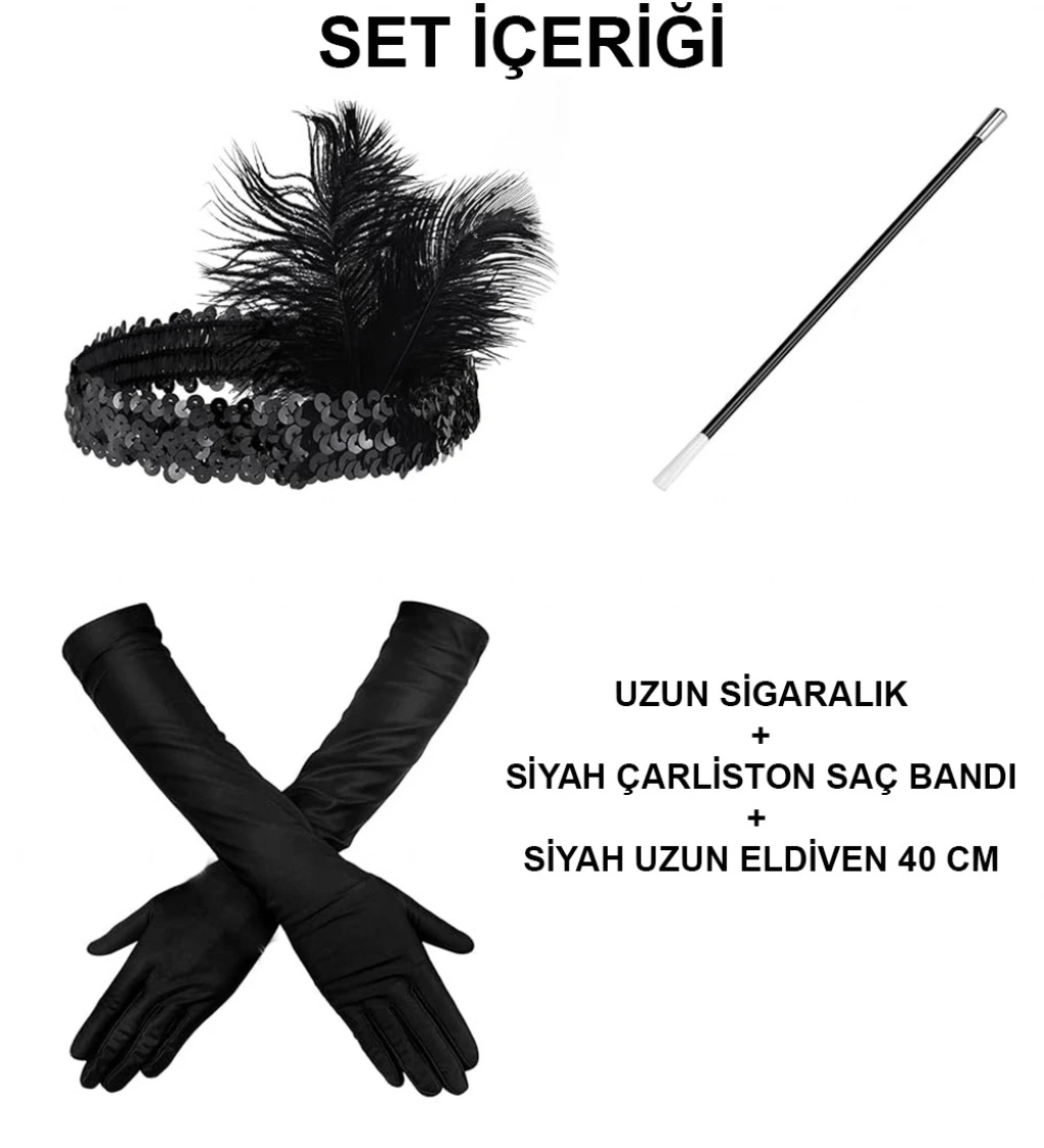 ÇOK SATAN 1920'ler Gatsby Aksesuar Seti – Siyah Charleston Saç Bandı, Uzun Eldiven & Sigaralık