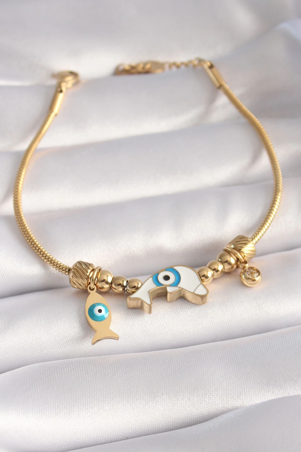 ÇOK SATAN 316L Çelik Gold Renk Balık Figür Nazar Boncuk İşleme Kadın Bileklik