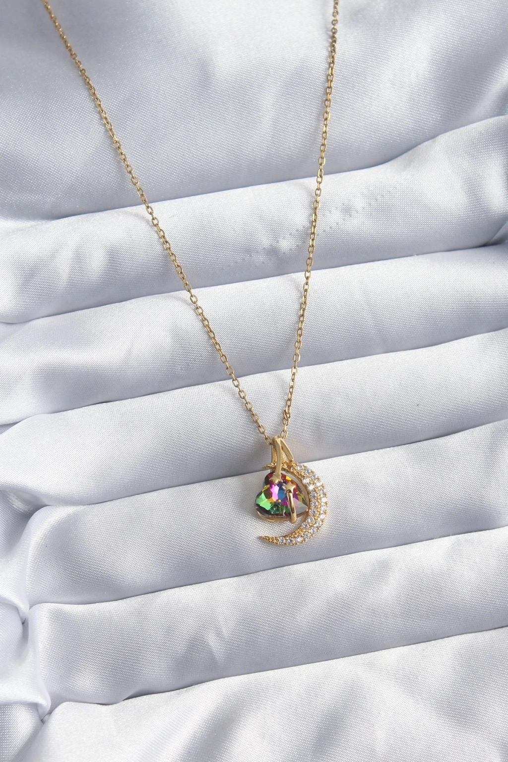 ÇOK SATAN 316L Çelik Zincir Gold Renk Zirkon Taşlı Hilal Kristal Kalp Model Kadın Kolye