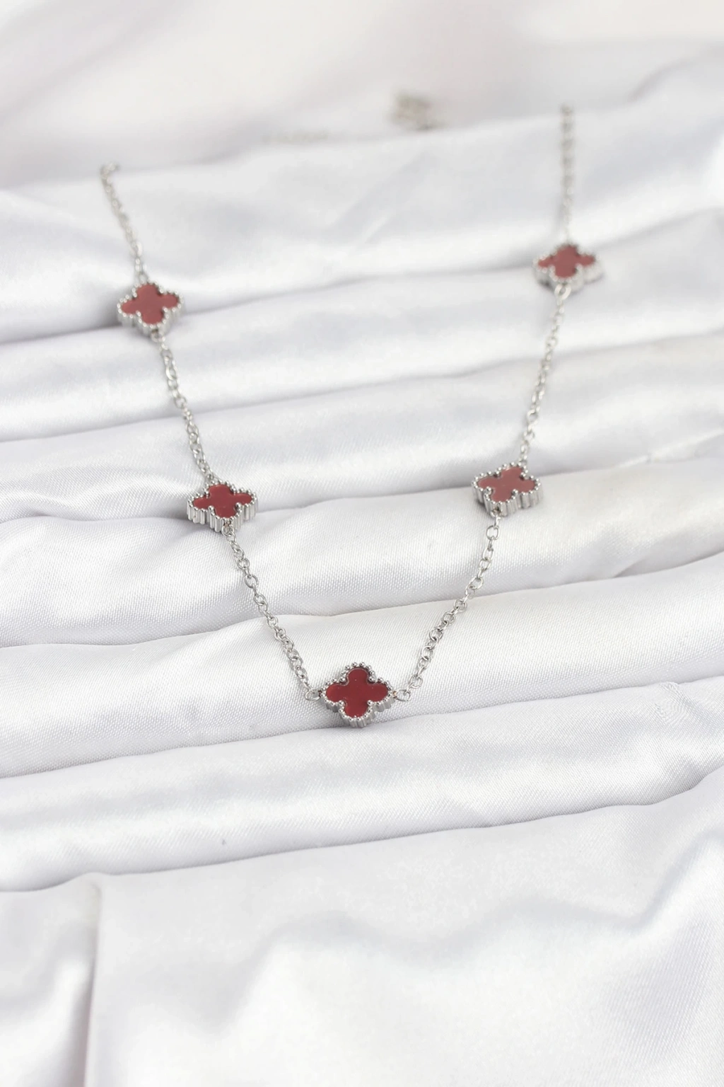 ÇOK SATAN 316L Çelik Zincir Gümüş Renk Bordo Baby Boy Yonca Kadın Kolye