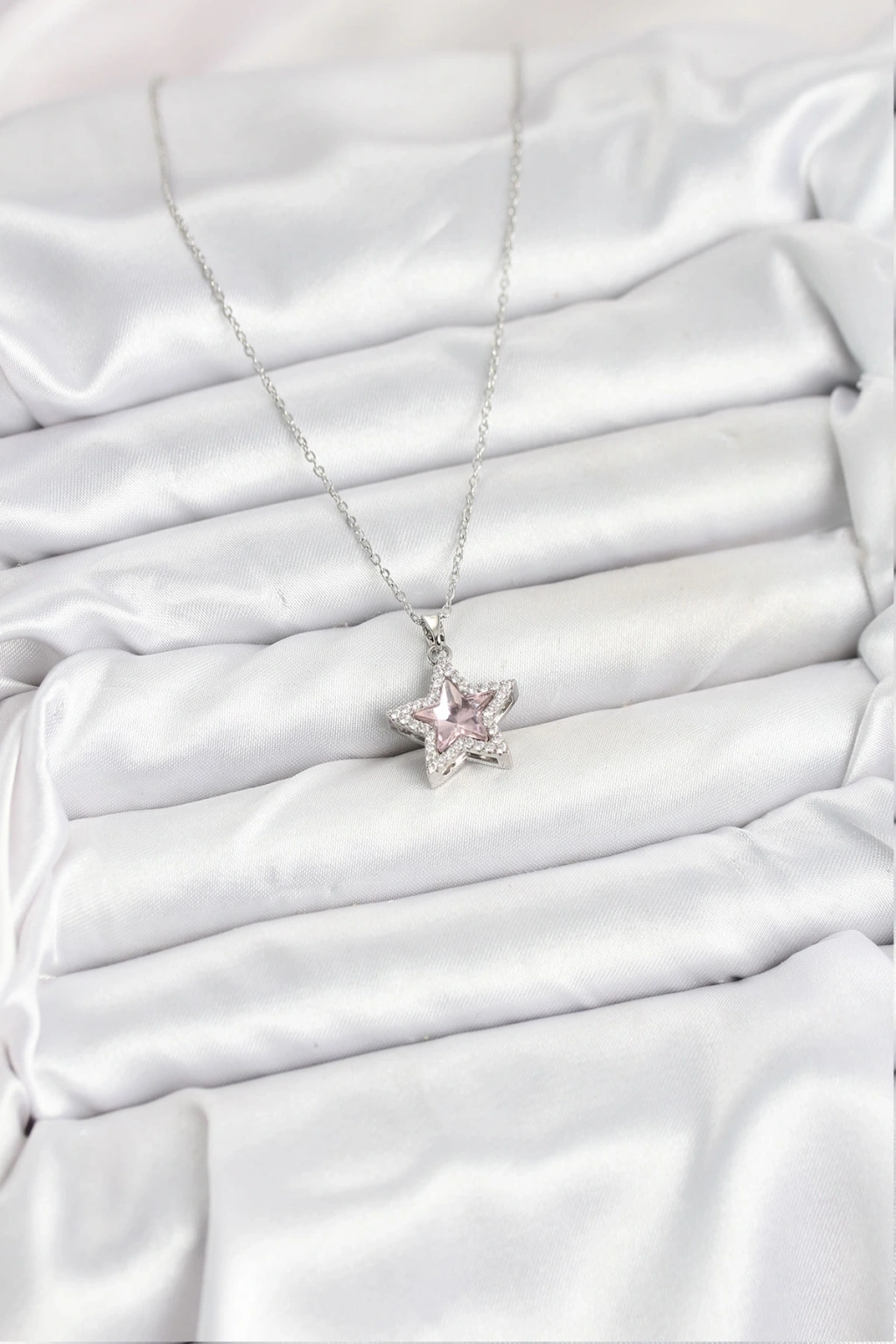 316L Çelik Zincir Gümüş Renk Pembe Taşlı Yıldız Model Kadın Kolye