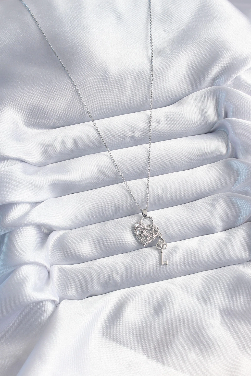 ÇOK SATAN 316L Çelik Zincir Gümüş Renk Zirkon Taşlı Kalp & Anahtar Model Kadın Kolye