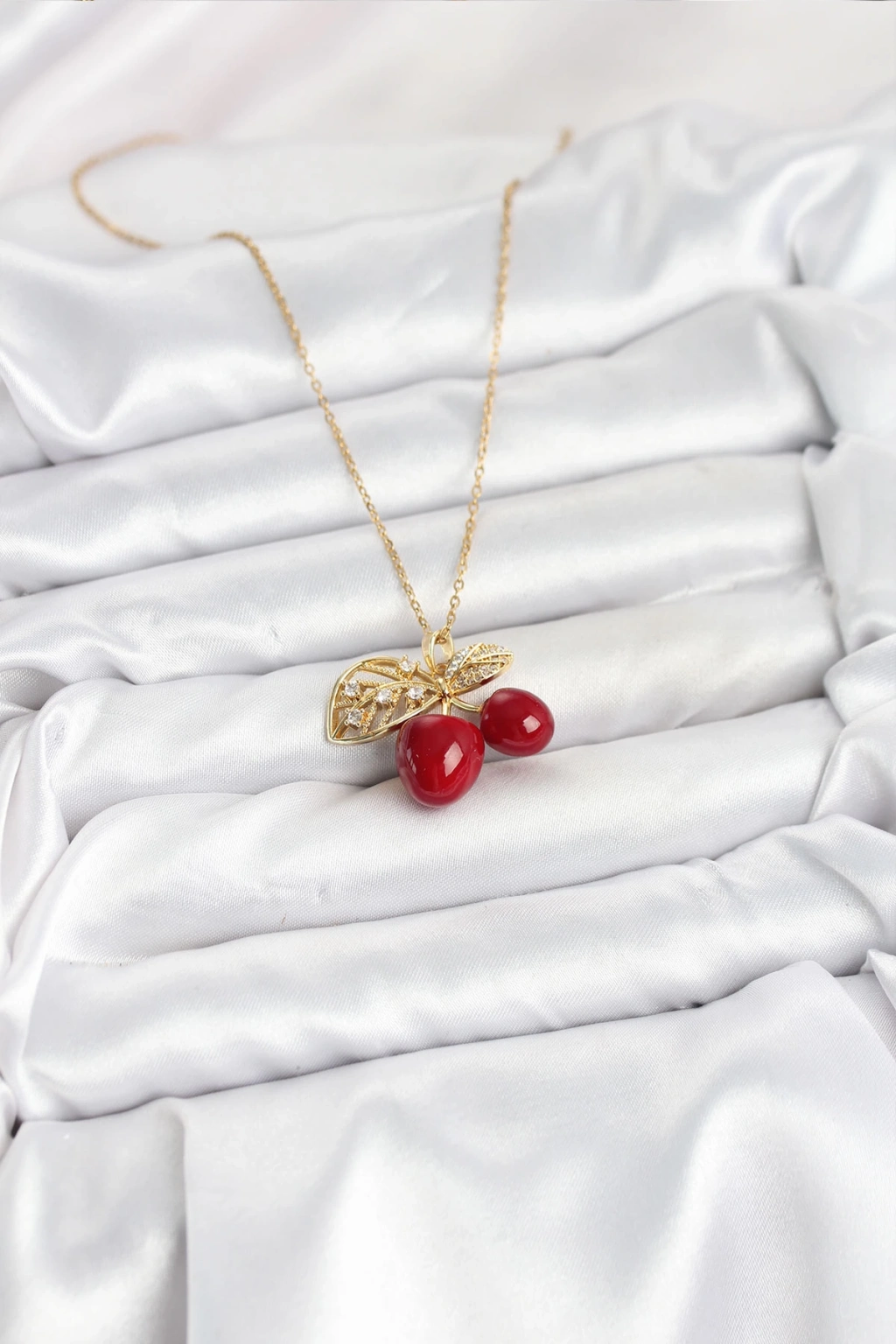 ÇOK SATAN 316L Çelik Zincir Yapraklı Kiraz Model Gold Renk Kadın Kolye