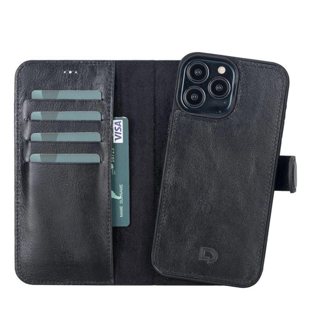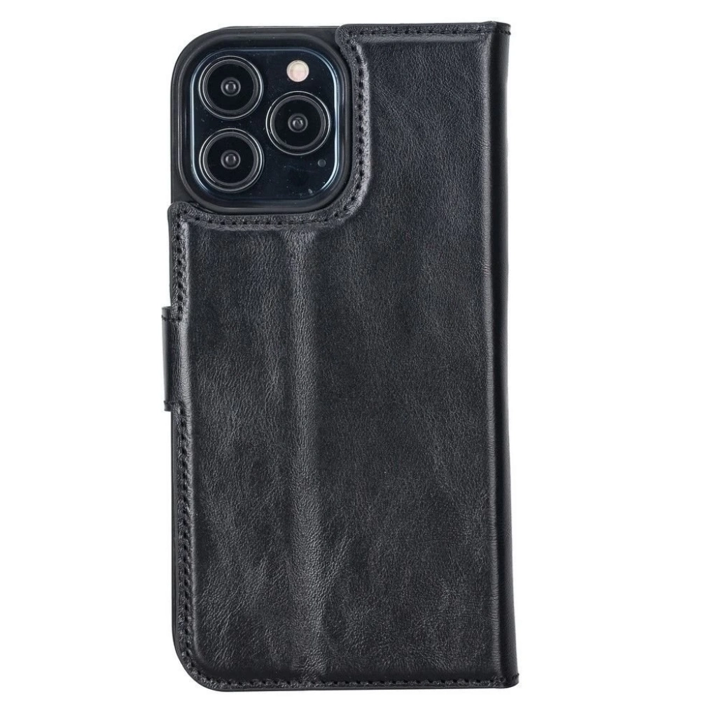 • Apple iPhone 13 Pro Max Uyumlu Deri Cüzdanlı Kılıf Rustik Siyah