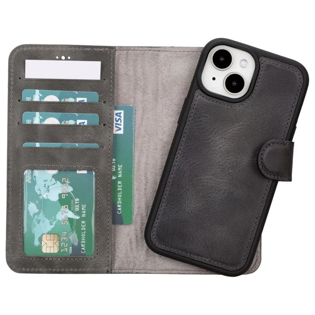 • Apple iPhone 15 Uyumlu Deri Cüzdanlı Kılıf MWWN VS4EF Gri