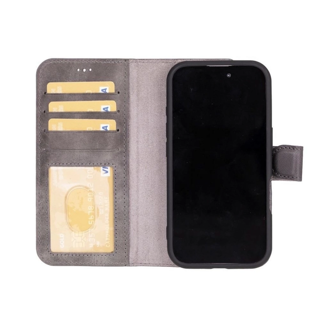 • Apple iPhone 16 Plus uyumlu, Hakiki Deri, El Yapımı, Cüzdanlı Kılıf, Gölgeli Gri