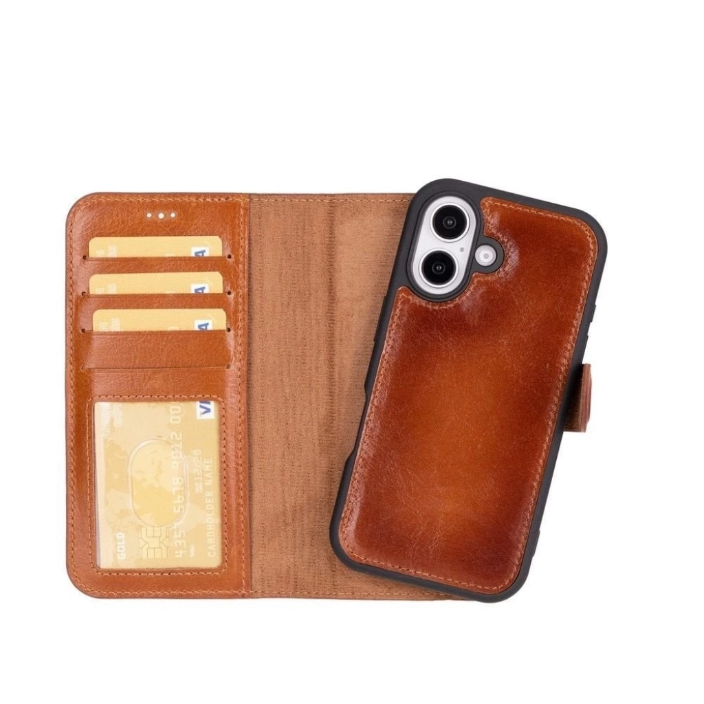 • Apple iPhone 16 Plus uyumlu, Hakiki Deri, El Yapımı, Cüzdanlı Kılıf, Gölgeli Taba