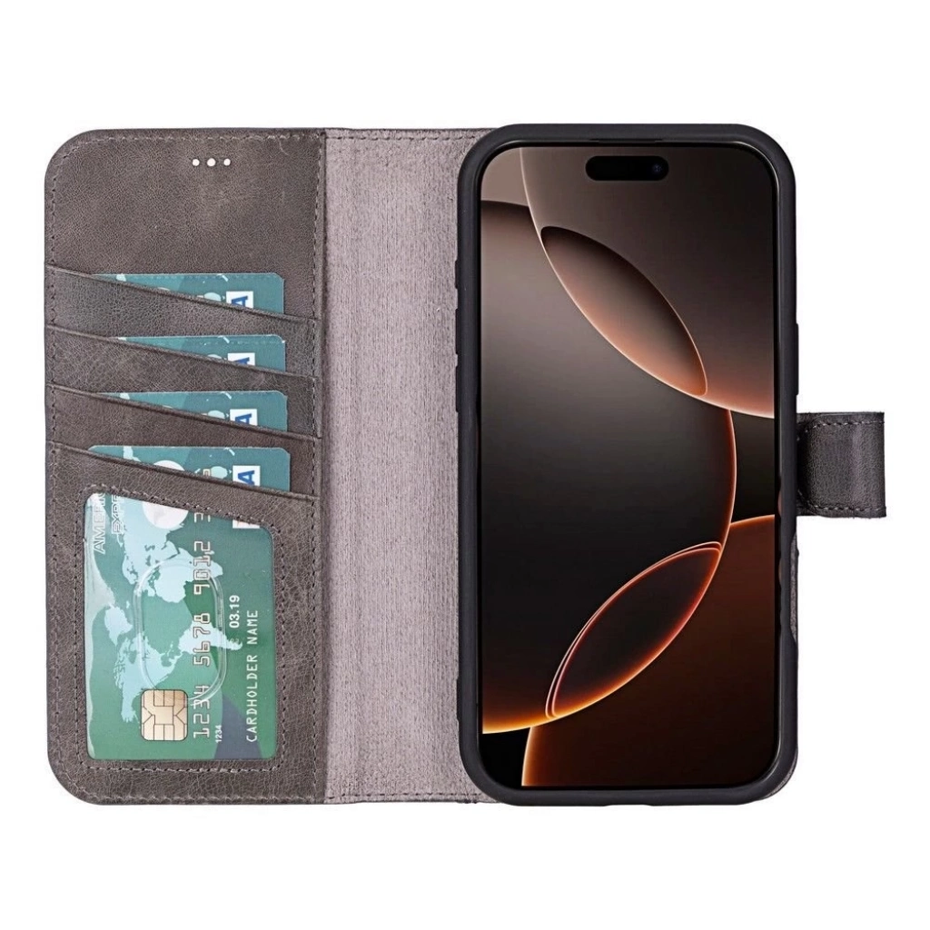 • Apple iPhone 16 Pro uyumlu, Hakiki Deri, El Yapımı, Cüzdanlı Kılıf, Gölgeli Gri