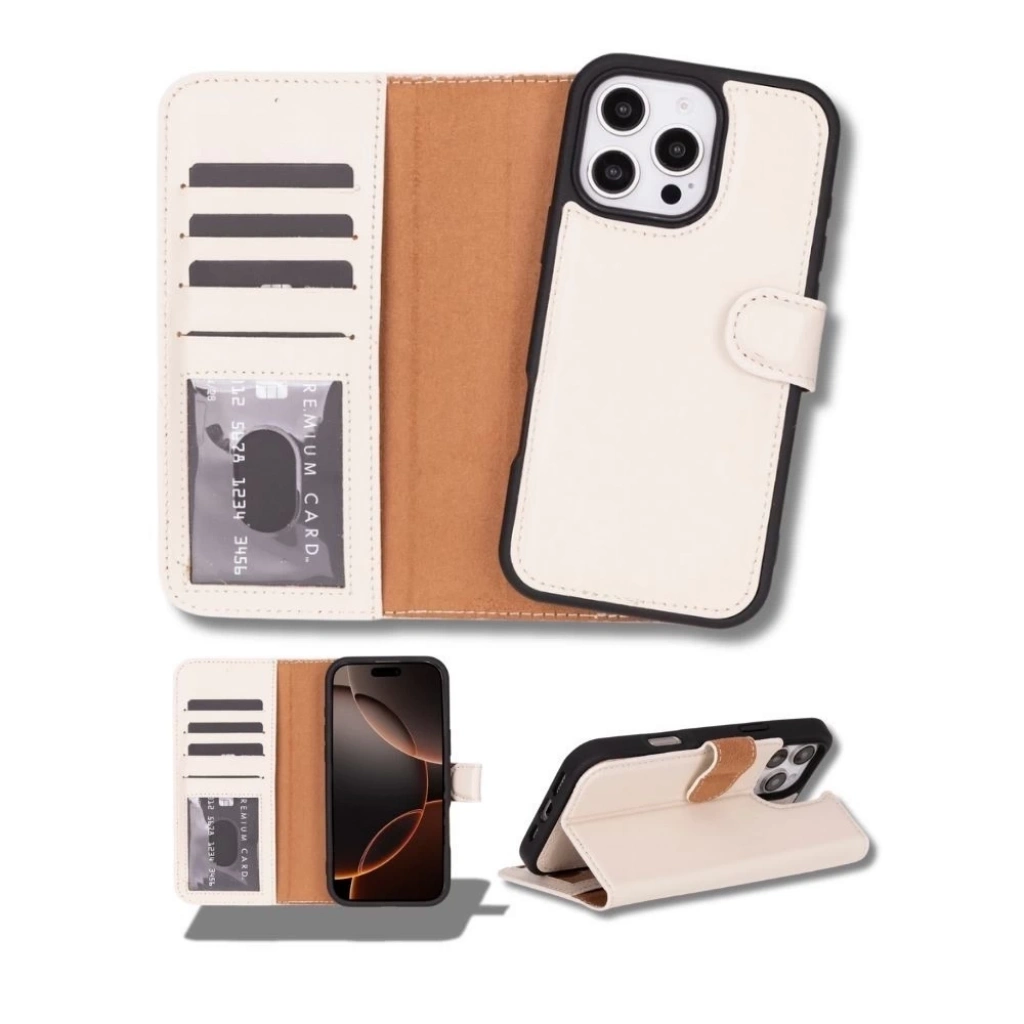 ÇOK SATAN Apple iPhone 16 Pro uyumlu, Hakiki Deri, El Yapımı, Cüzdanlı Kılıf, Krem Renk