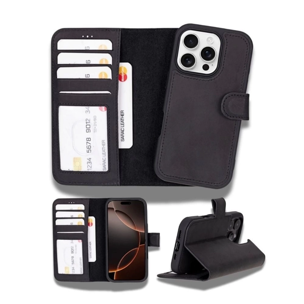 • Apple iPhone 16 Pro uyumlu, Hakiki Deri, El Yapımı, Cüzdanlı Kılıf, Mat Siyah