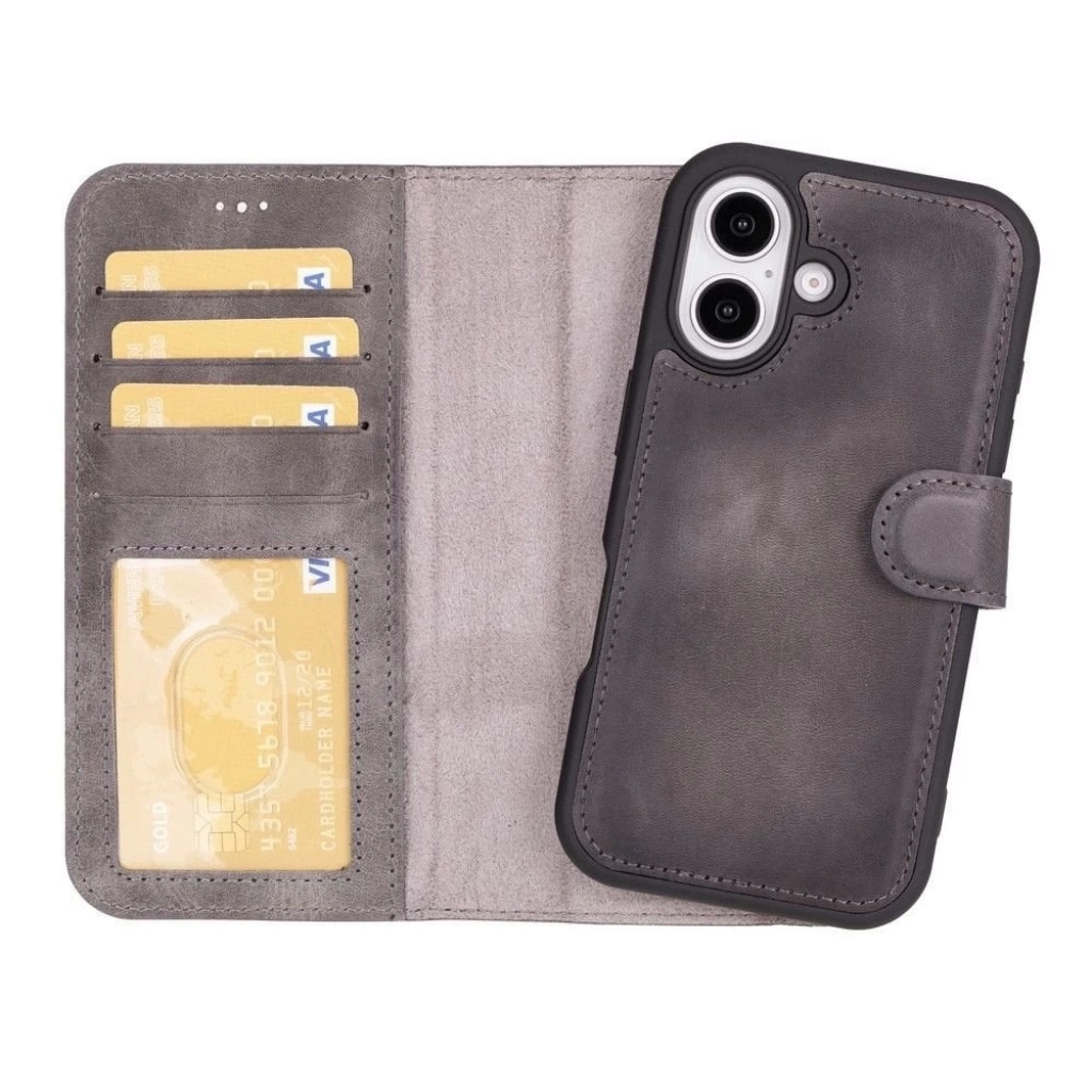 ÇOK SATAN Apple iPhone 16 uyumlu, Hakiki Deri, El Yapımı, Cüzdanlı Kılıf, Gölgeli Gri