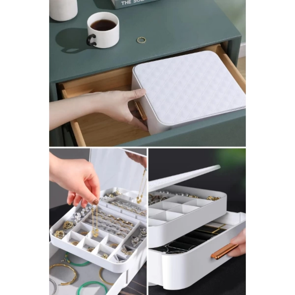 AYNALI TAKI ORGANİZERİÜrün ÖzellikleriAynalı takı organizeri, şık ve fonksiyonel tasarımıyla takılarınızı düzenli bir şekilde saklamanız için mükemmel bir çözümdür. İç kısmında bölmeli yapısı sayesinde yüzük, küpe, bileklik ve kolyelerinizi düzenli şekilde yerleştirebilirsiniz. Üst kapağında bulunan ayna sayesinde takılarınızı rahatça takabilir ve kombinlerinize kolayca karar verebilirsiniz. Çekmeceli yapısı ek depolama alanı sunarak büyük takılar için ideal bir saklama alanı oluşturur. Modern ve zarif tasarımı ile hem şıklık hem de kullanım kolaylığı sağlar.Paket İçeriği1 Adet Aynalı Takı Organizeri