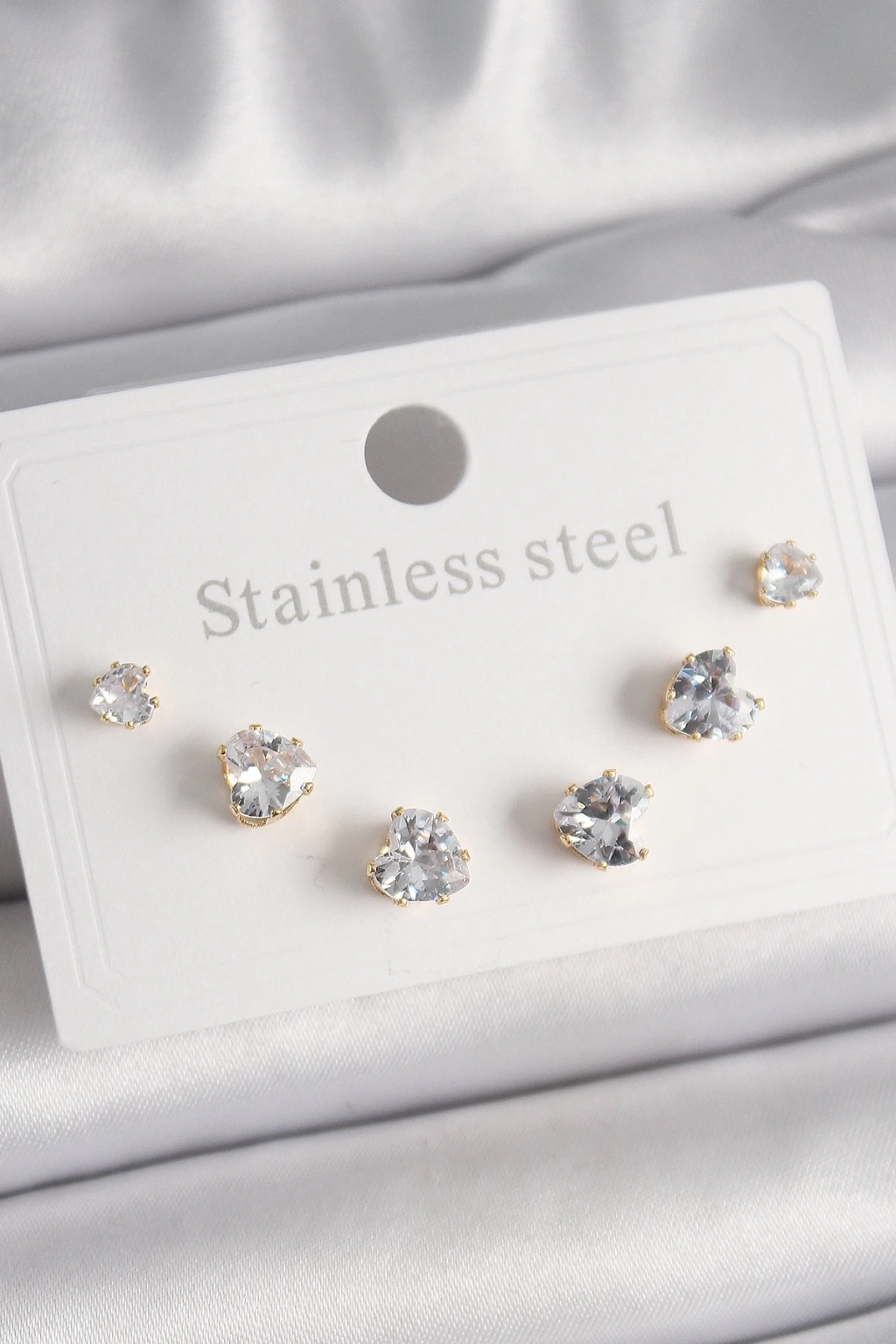BFS 316L Çelik Gold Renk Zirkon Taşlı Kalp Model Kadın Küpe Seti