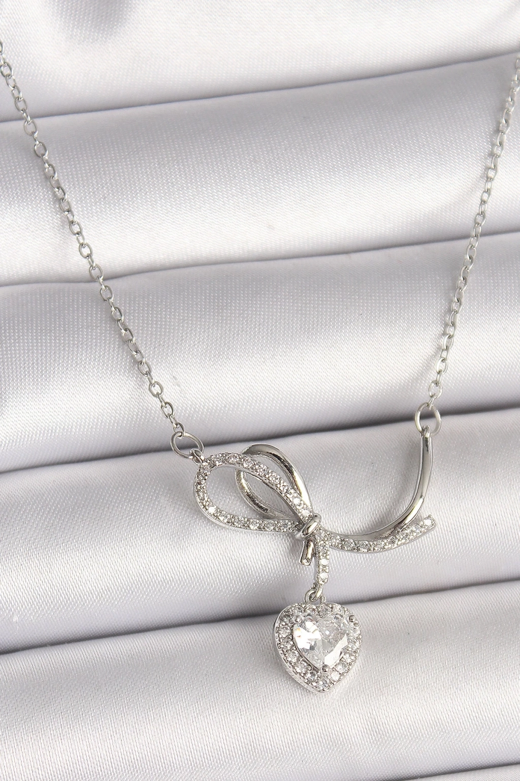 BFS 316L Çelik Gümüş Renk Zincir Zirkon Taşlı Düğüm Sallantı Kalp Figür Kadın Kolye