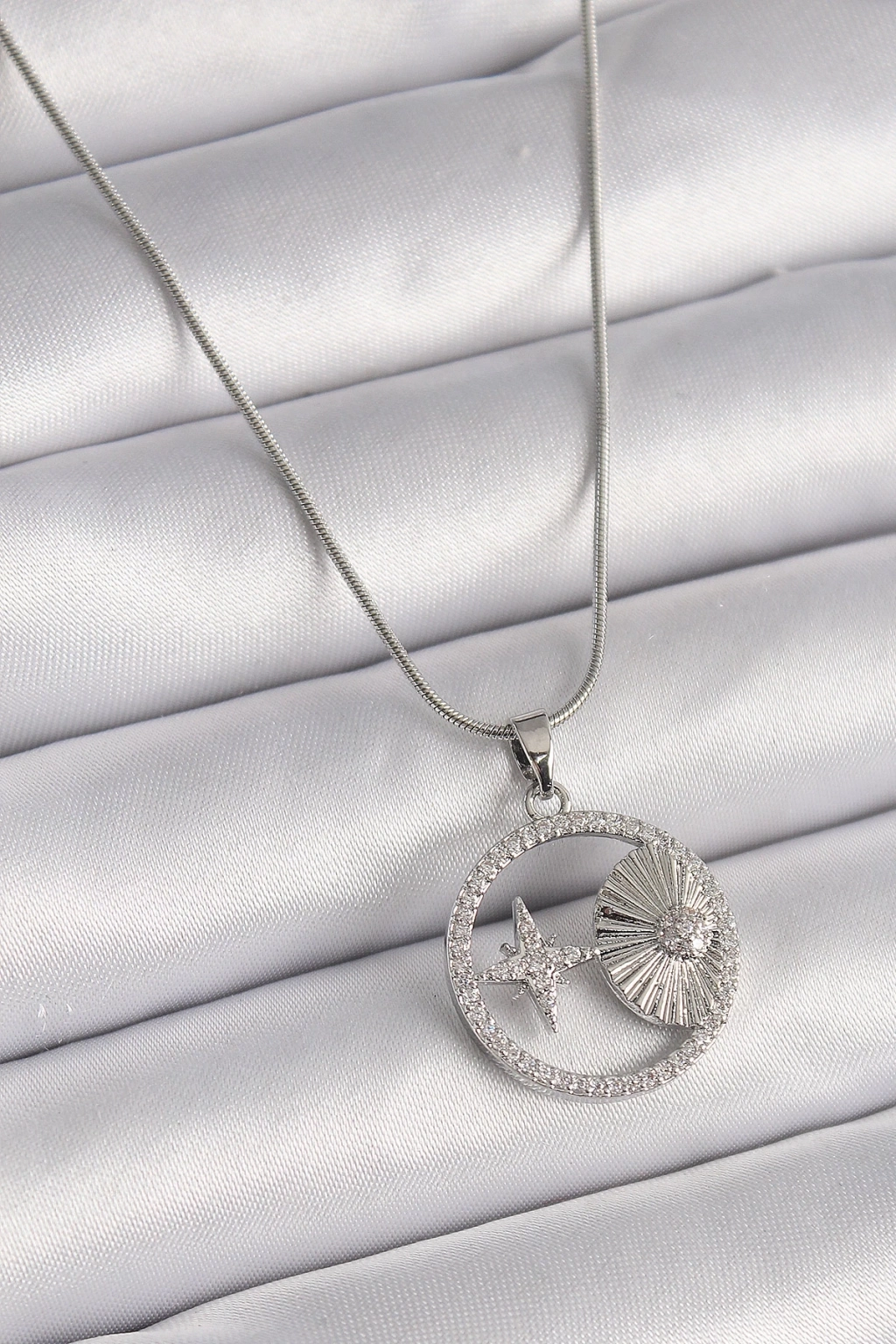BFS 316L Çelik Gümüş Renk Zincir Zirkon Taşlı Yıldız Madalyon Model Kadın Kolye