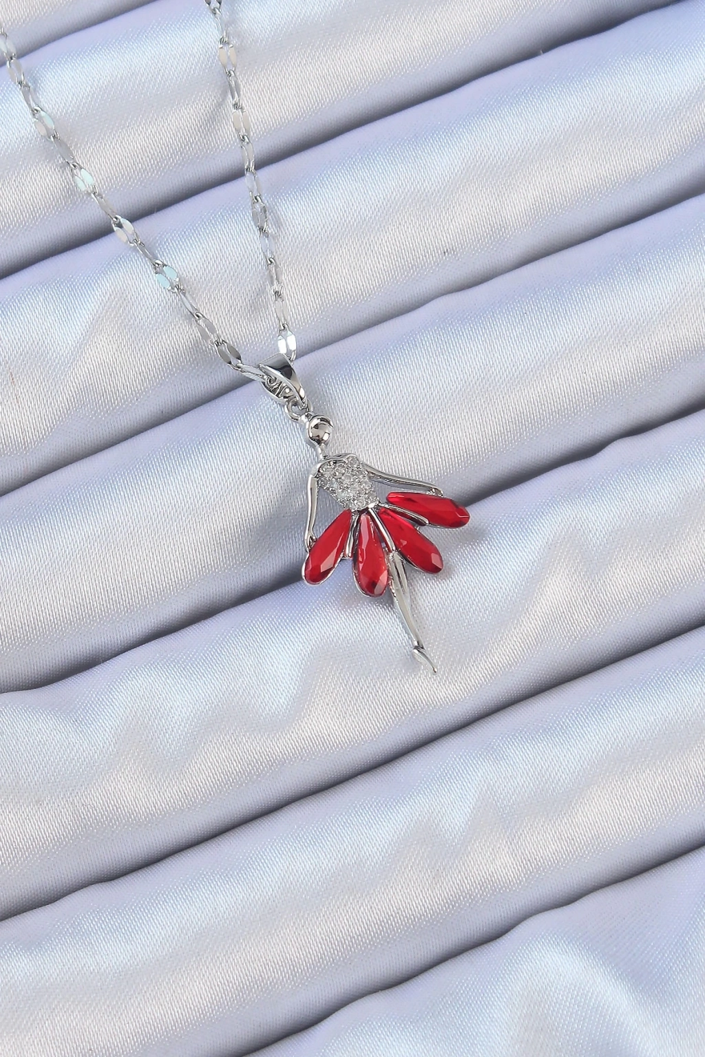 BFS 316L Çelik Zincir Gümüş Renk Kırmızı Etekli Zirkon Taşlı Balerin Kolye