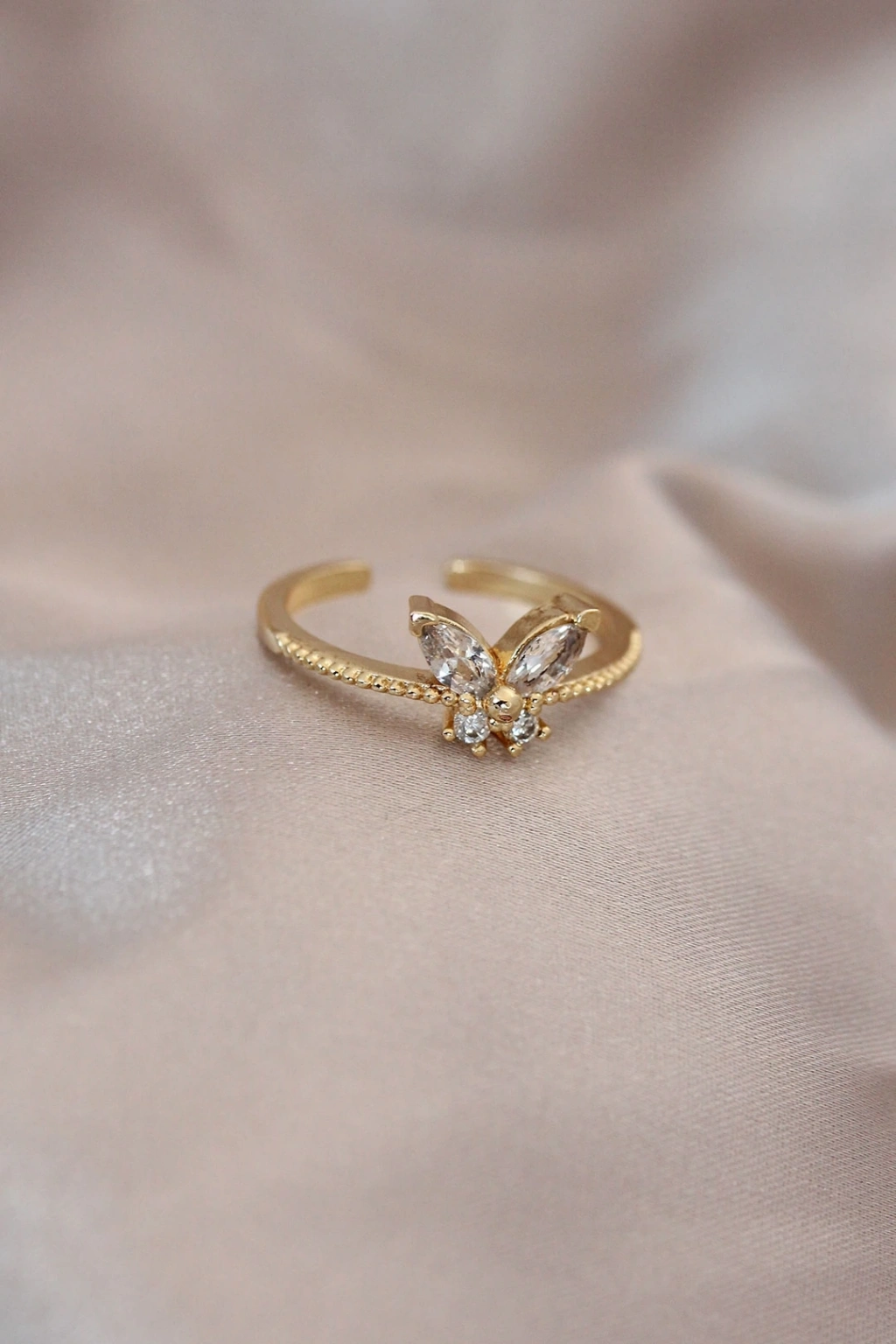• BFS Ayarlamalı Altın Renk Metal Zirkon Taş ve Kristal Taşlı Kelebek Model Yüzük