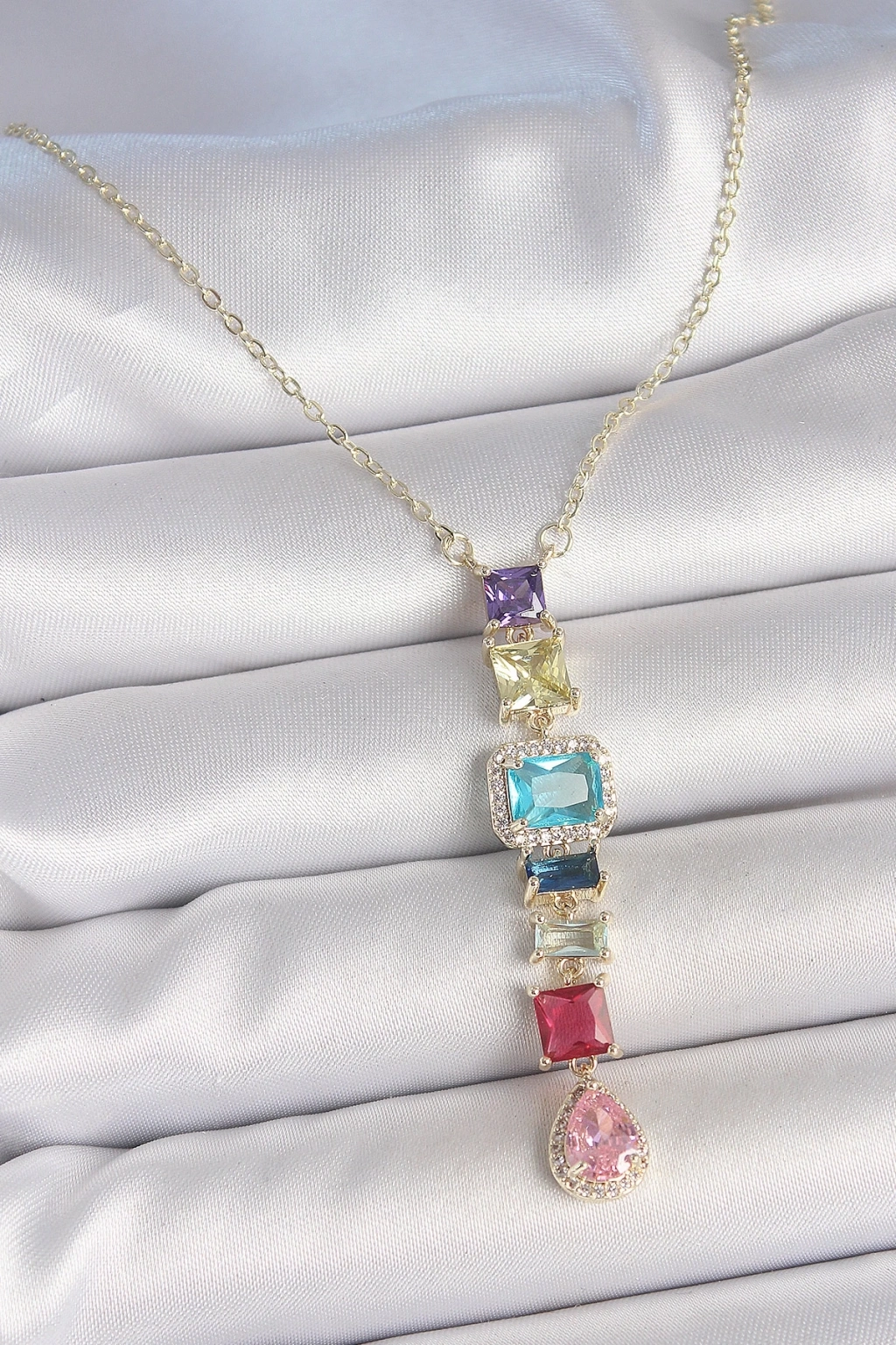 BFS Gold Karışık Renk Zirkon Taşlı Y Pirinç Kolye