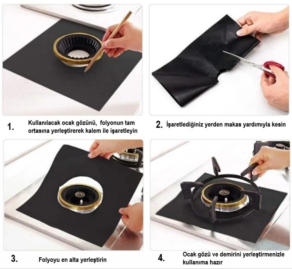 Paket içeriği:  4 adet Ocak Koruyucu Folyo Yanmaz Yapışmaz SiYAH