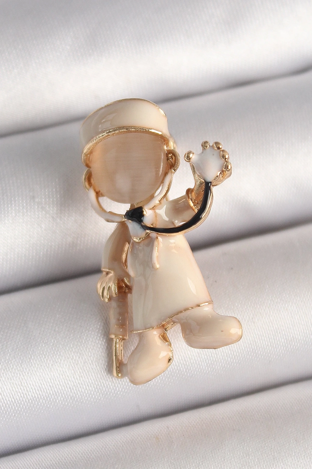 BFS Pirinç Gold Renk Beyaz Mineli Doktor Model Kadın Broş