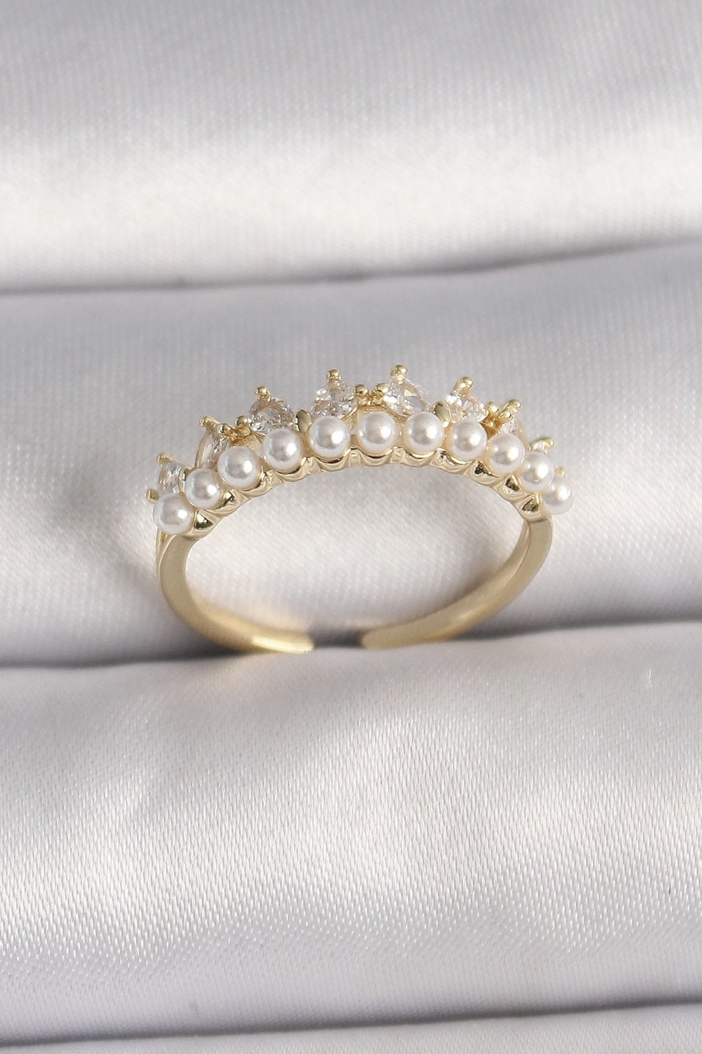 • BFS Pirinç Gold Renk Zirkon Taşlı İncili Taç Model Ayarlanabilir Kadın Yüzük