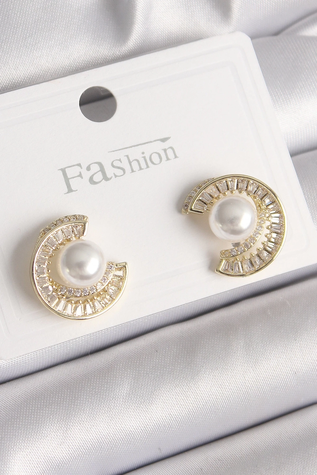 BFS Pirinç Gold Renk Zirkon Taşlı Salyangoz Model İnci Detay Kadın Küpe
