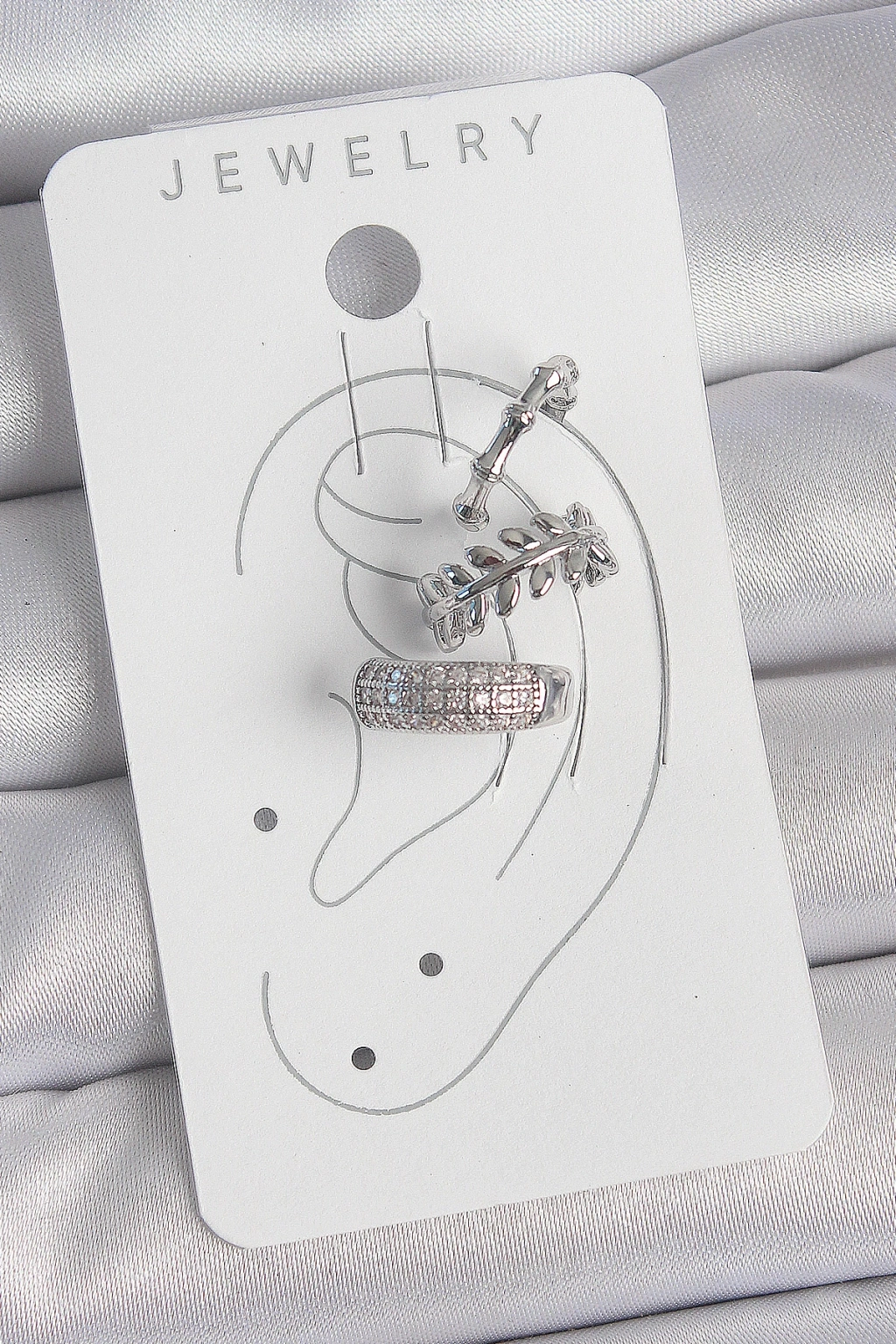 ÇOK SATAN BFS Pirinç Gümüş Renk Zirkon Taşlı 3'Lü Model Yaprak Figür Kadın Kıkırdak Küpe