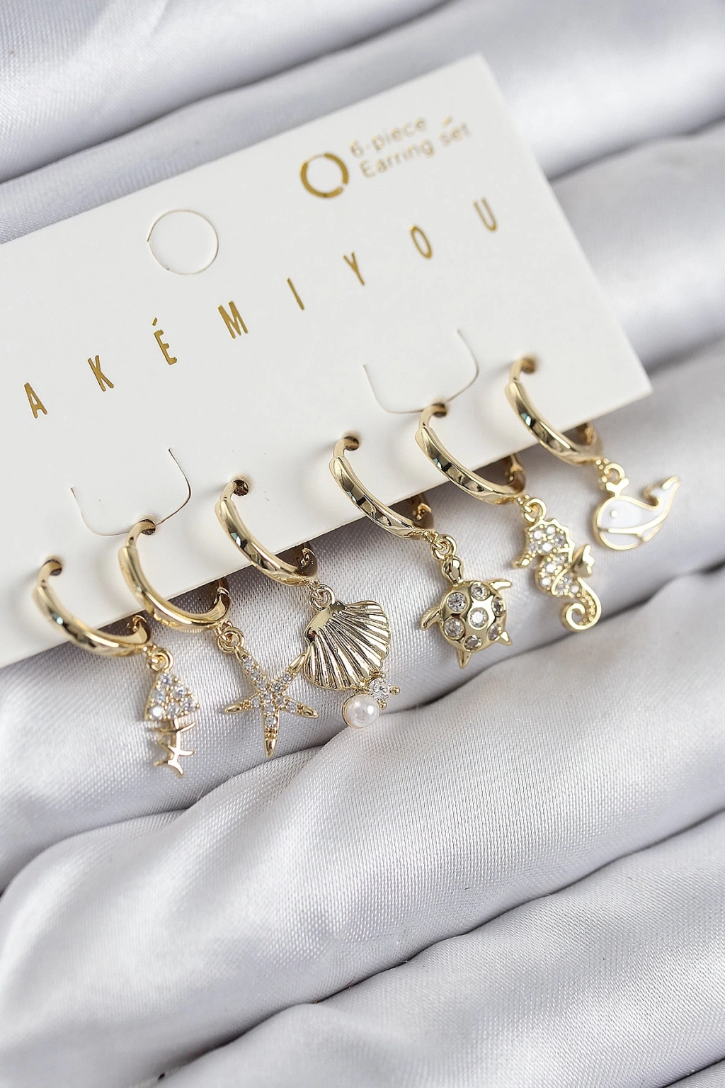 • BFS Pirinç Zirkon Taşlı İstiridye Balina Ve Yıldız Gold Renk 6'lı Küpe Set