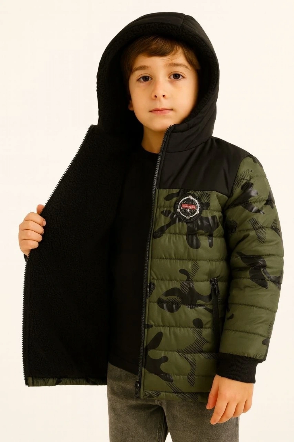 Kamuflaj Desenli Mont İçi Sıcak Tutan Pelüş Astarlı, Kapüşonlu, Fermuarlı Kışlık Su İtici Şişme Mont - Haki
