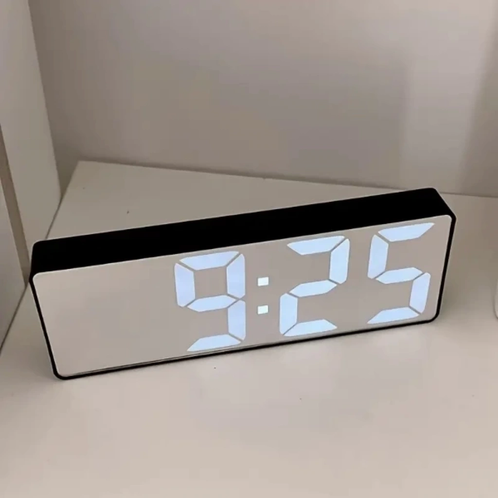 DİJİTAL SESE DUYARLI ALARMLI MASA SAATİÜrün ÖzellikleriDijital Sese Duyarlı Alarmlı Masa Saati, büyük ve net rakamlar ile saati kolaylıkla okuma imkanı sağlar. Ön yüzey kapalı olduğunda, ayna efektiyle şık bir görünüm sunar. Ekran, sesle (alkış, dokunuş gibi) aktive olabilir. Ayarlanabilir alarm özelliği, zaman yönetimini kolaylaştırır ve ihtiyaçlarınıza göre alarm süresini ayarlamanıza imkan tanır. Ayrıca, ortam sıcaklığını dijital olarak gösterir (°C/°F). Gün, ay ve yıl bilgilerini de görüntüleyebilme özelliği bulunur. Pil ile çalışır, piller dahil değildir. 14x5 cm boyutundadır. Arka panelde, zaman ayarı, mod geçişleri ve alarm için özel butonlar yer alır. Bu şık masa saati, ev, ofis, yatak odası veya çalışma alanlarında estetik bir görünüm sunar.Paket İçeriği1 Adet Dijital Sese Duyarlı Alarmlı Masa Saati